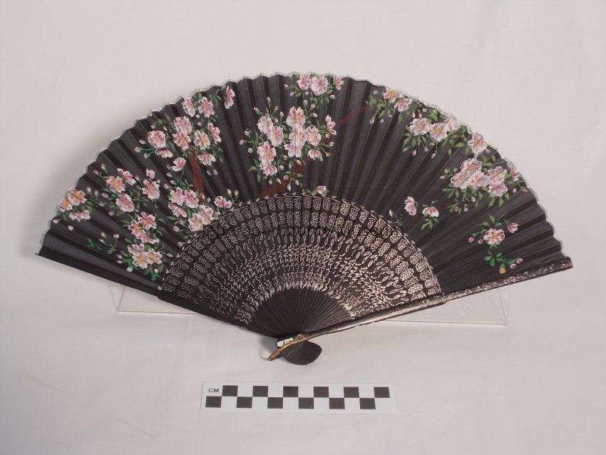 Black silk fan with pink and white flowers with green leaves. Silk is attached to wood ribs for support. Thin brass ring at bottom. Circa 1880.Acquisition