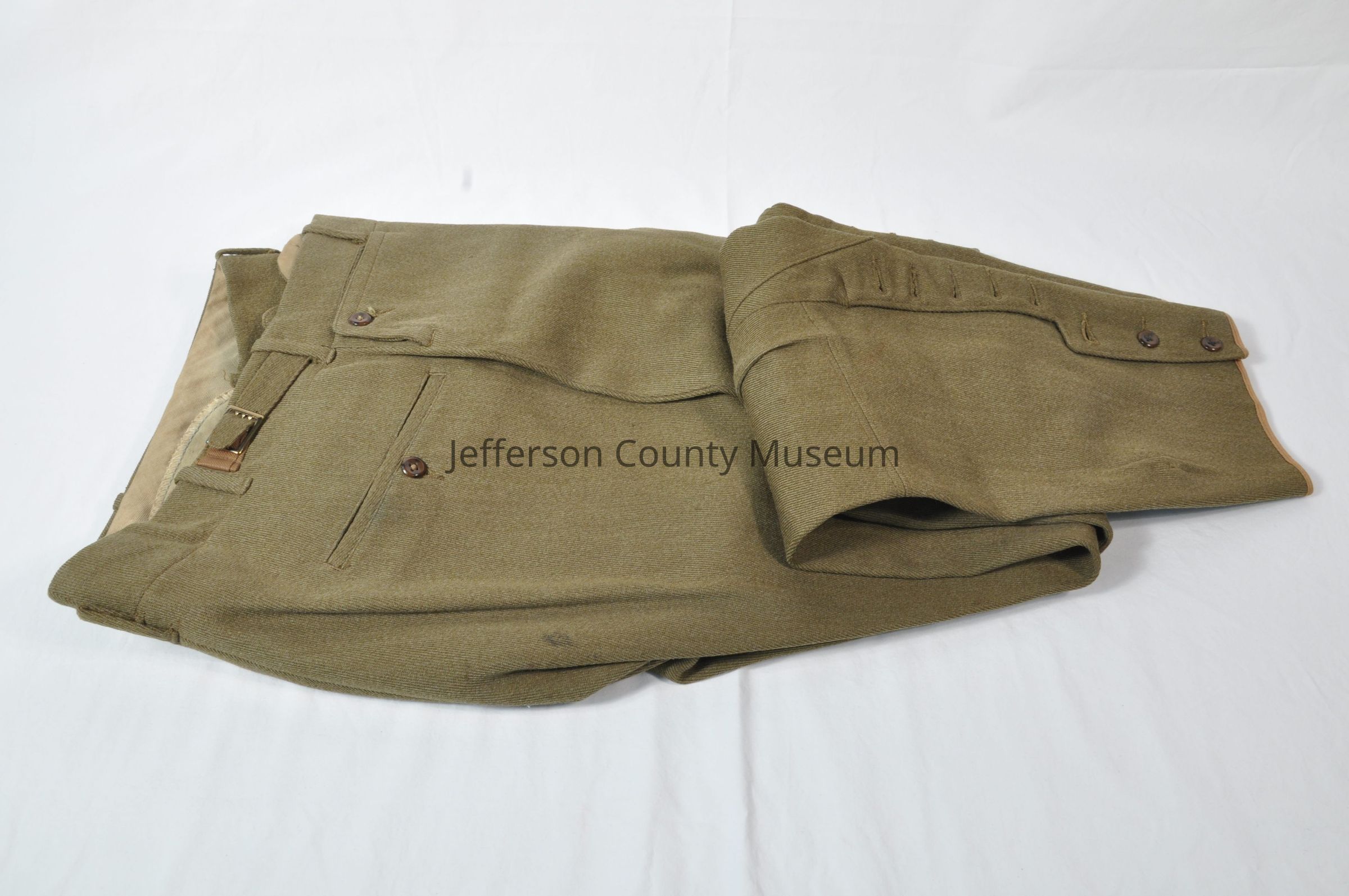 World War I uniform pants with button fly, brass buckles on each side of waist for tightening. Made in jodhpur style for riding horses with extra padding for knees and inner thighs and buttons down side from below knee to bottom. Goes with jacket catalog #622.Acquisition