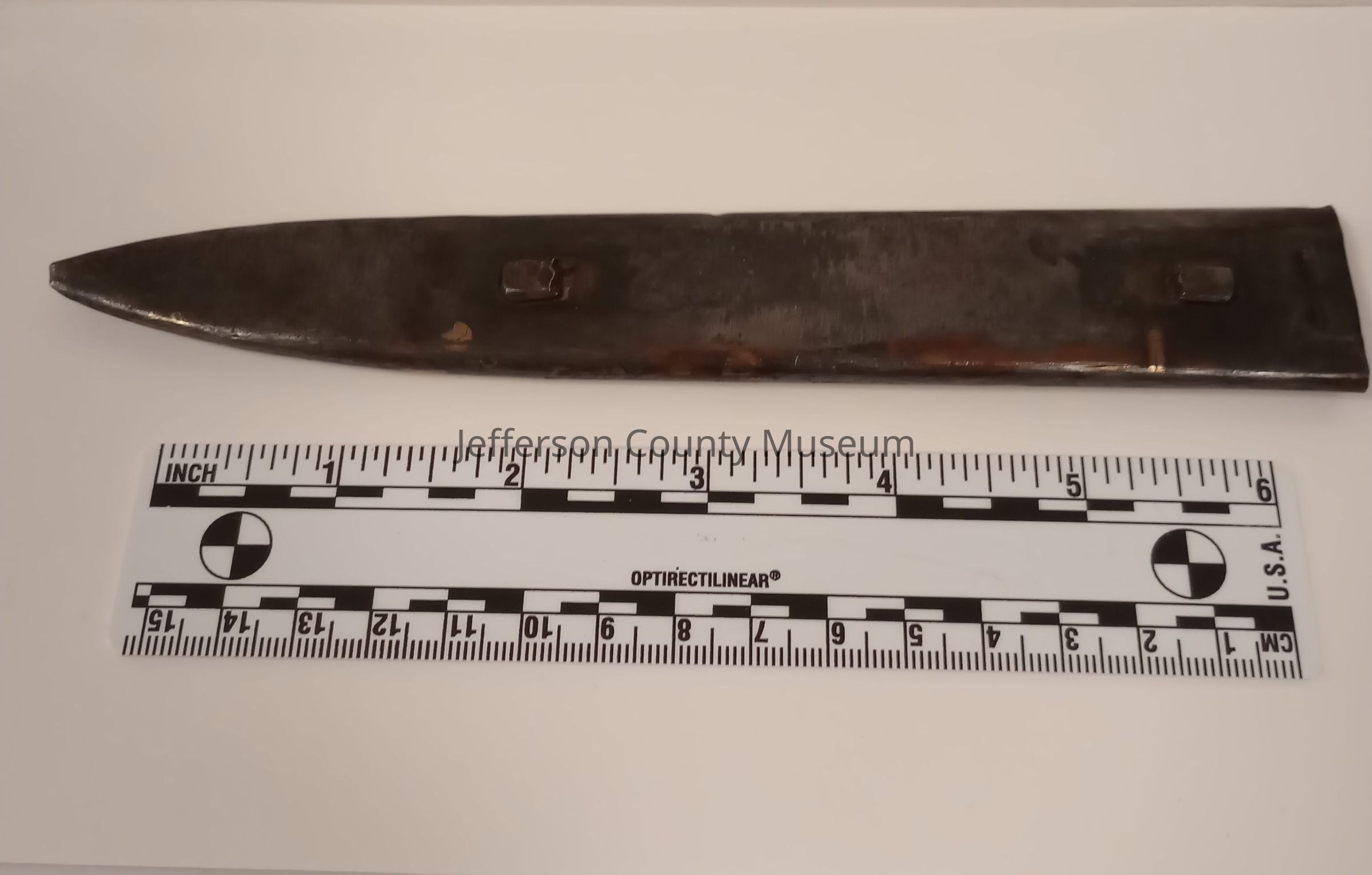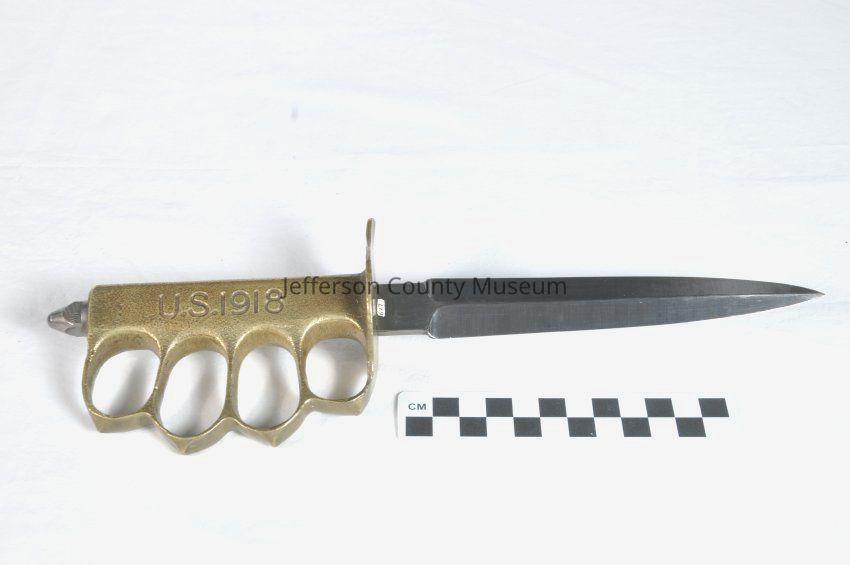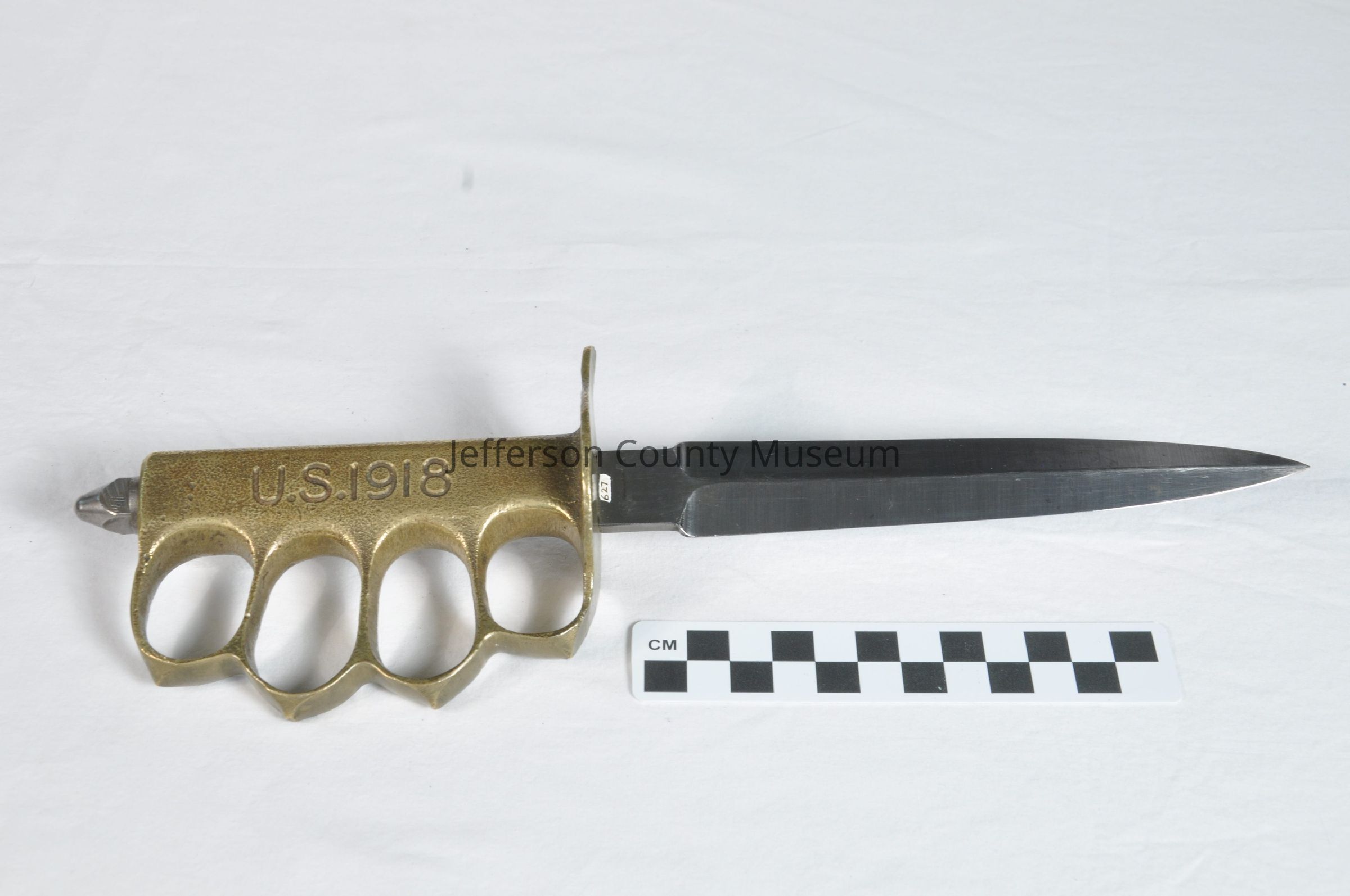World War I trench knife (627a). Brass grip with 4 pointed knuckle grips. "U.S. 1918" stamped on grip. Lion and "AU LION" on base of blade. Metal sheath (627b)