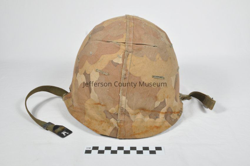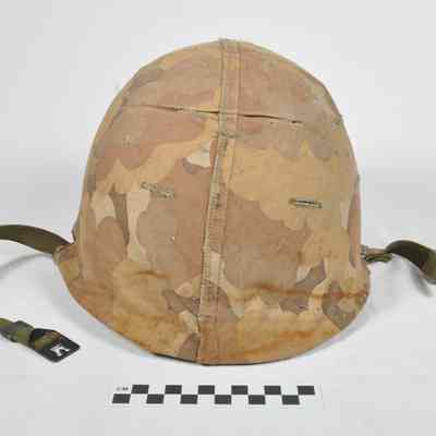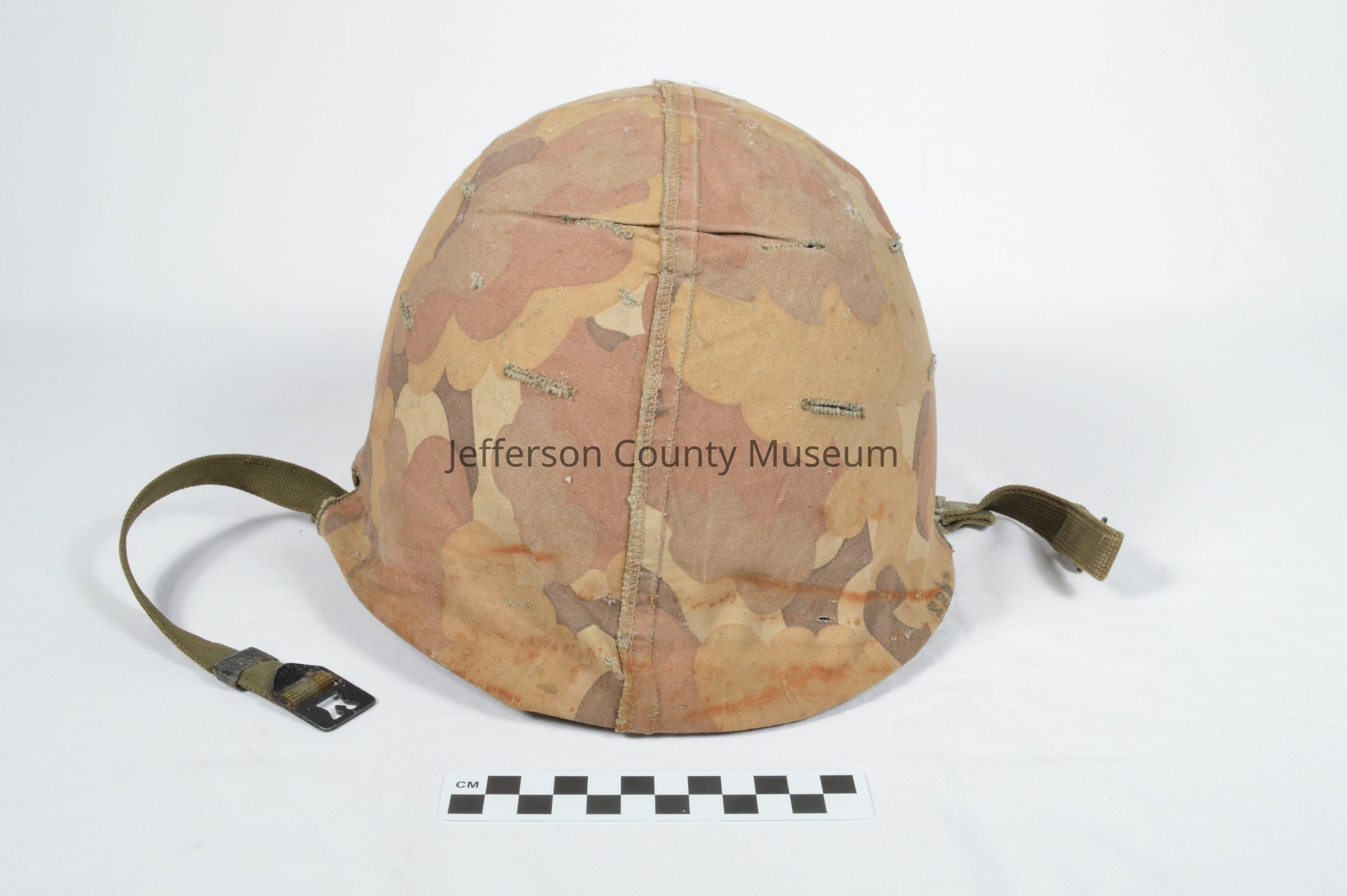Korean War era U. S. Marine helmet ("steel pot") with helmet liner and camouflage cover. Helmet has straps and buckle for clipping under chin. Helmet liner has "A. F. SAGER" stencilled on front twice. Camouflage cover has "COVER, HELMET, CAMOUFLAGE CONTRACT NO. 9005-8415-201-6833 stencilled on it. Cover has slits for adding vegetation. Helmet liner has leather and cloth suspension system for comfort of wearing.Acquisition