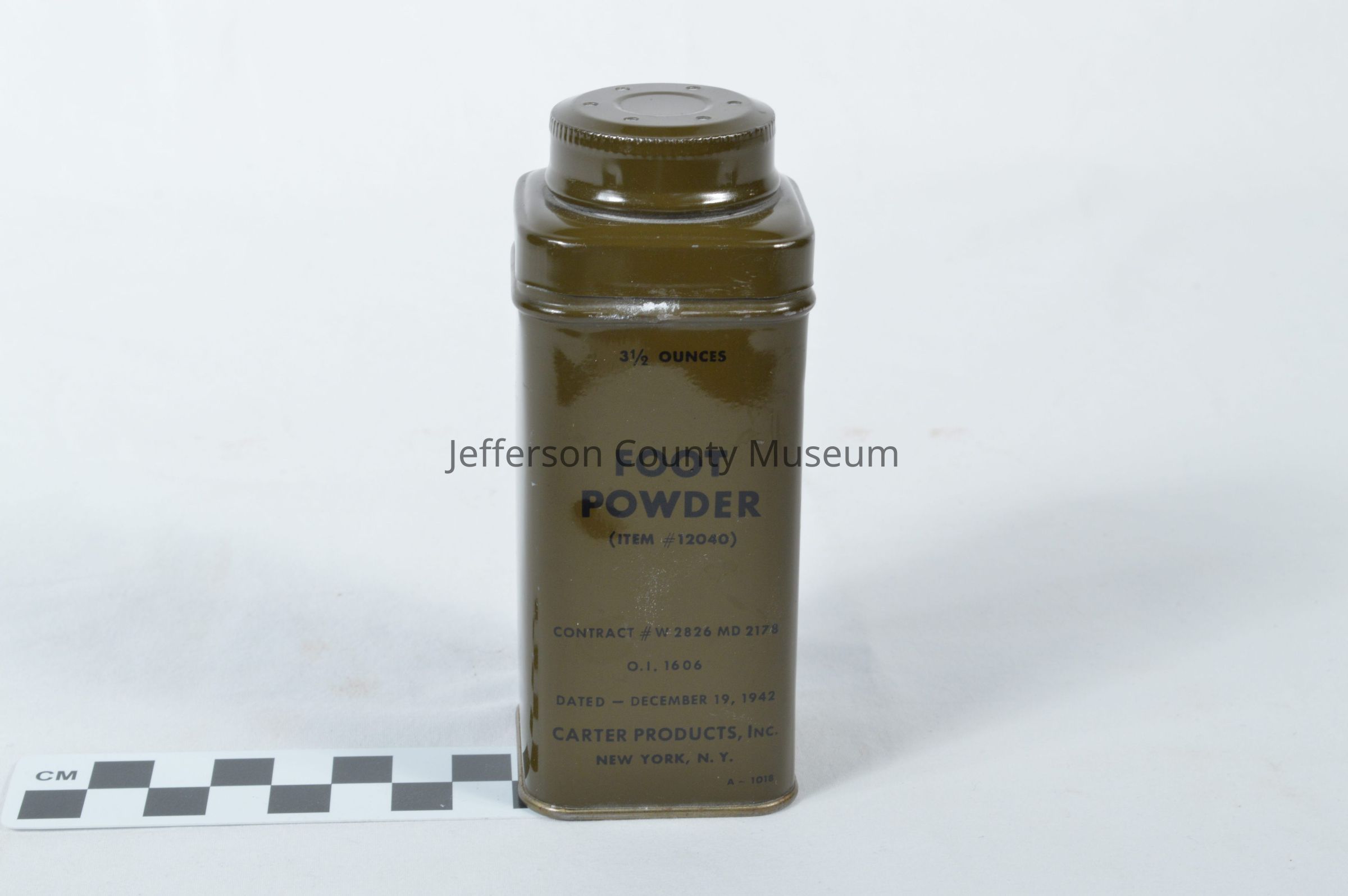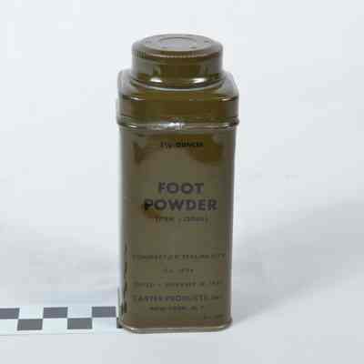 Tin can containing foot powder. Olive drab in color. Made by Carter Products, Inc., NY, NY. On front "3 1/2 OUNCES FOOT POWDER (ITEM # 12040)". Round twist top for dispensing.Acquisition
