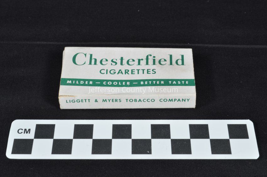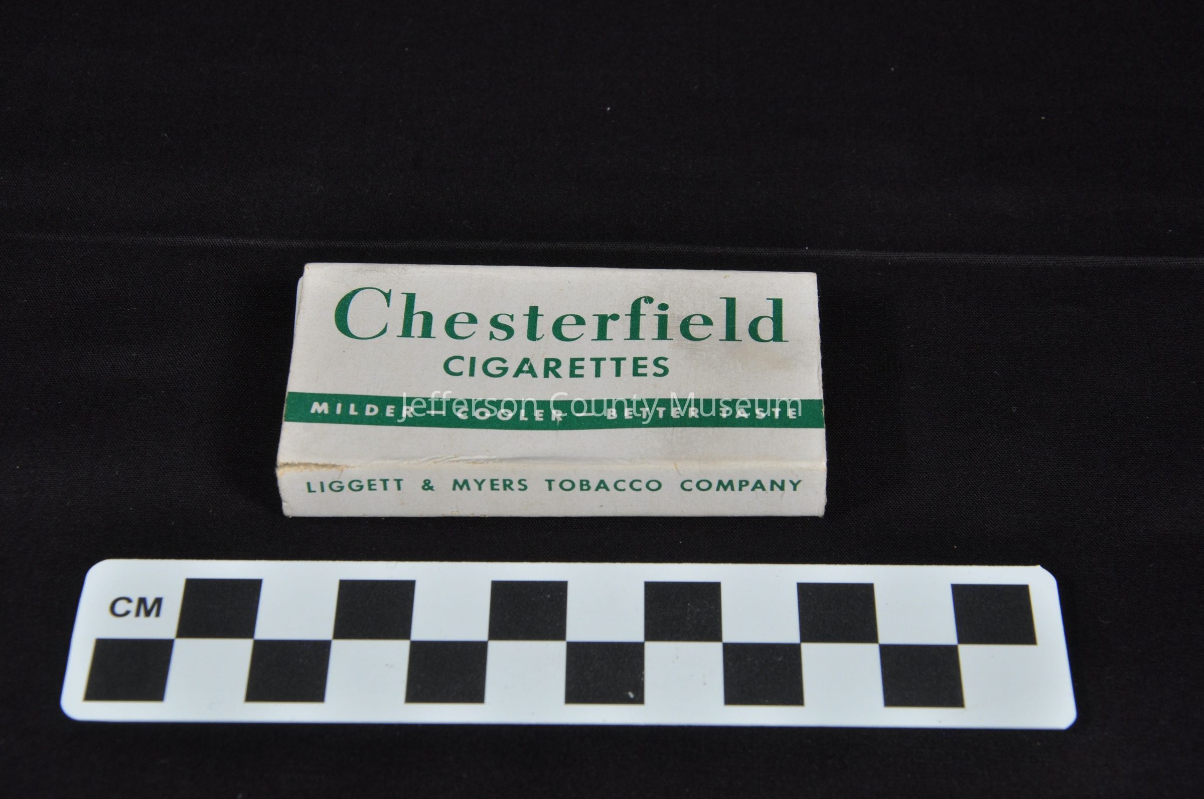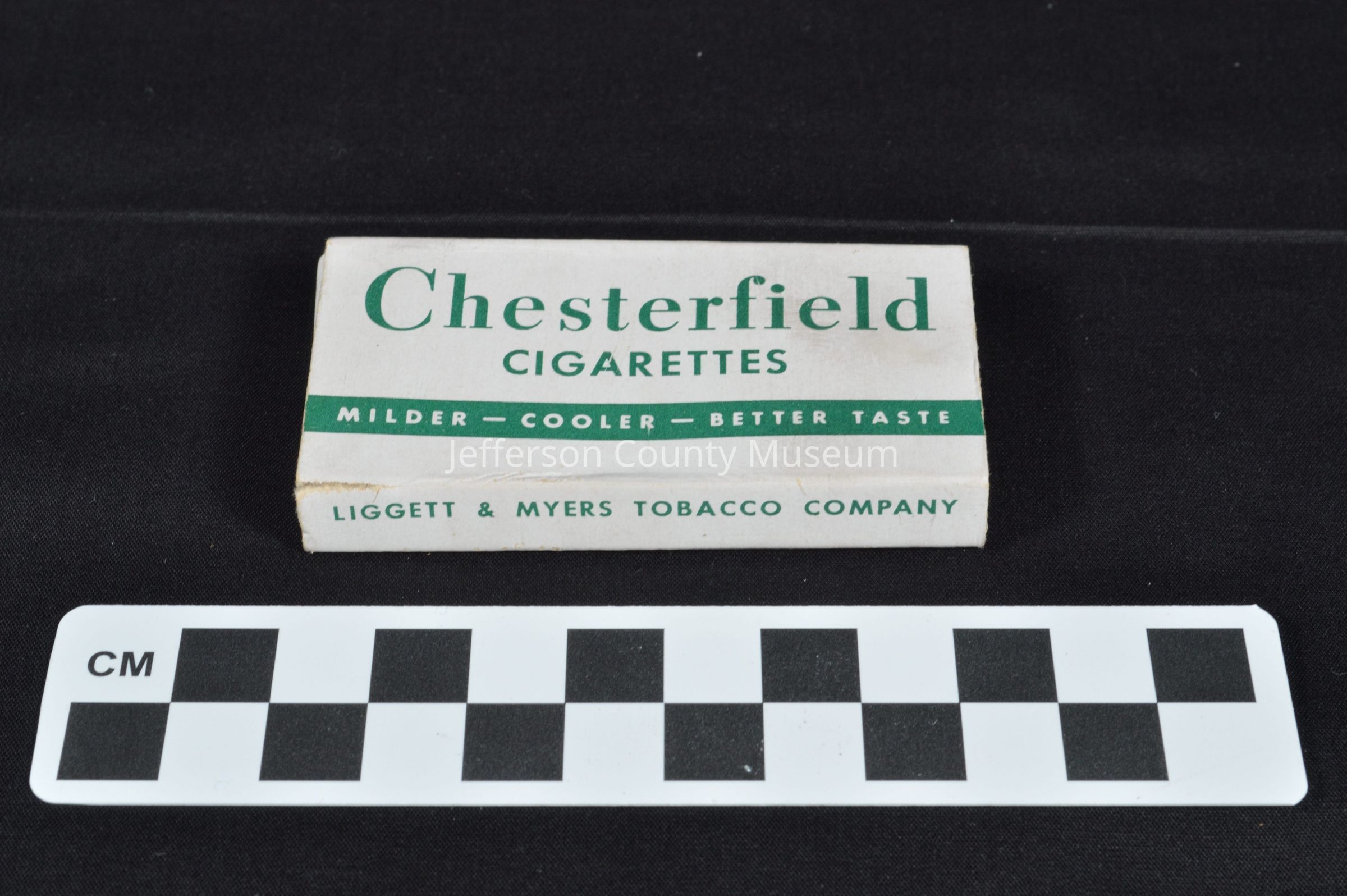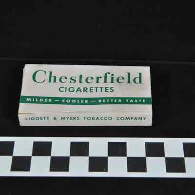 Small white cardboard box with green stripe. "Chesterfield CIGARETTES MILDER-COOLER-BETTER TASTE LIGGETT & MYERS TOBACCO COMPANY". Possibly from a K Ration pack.Acquisition