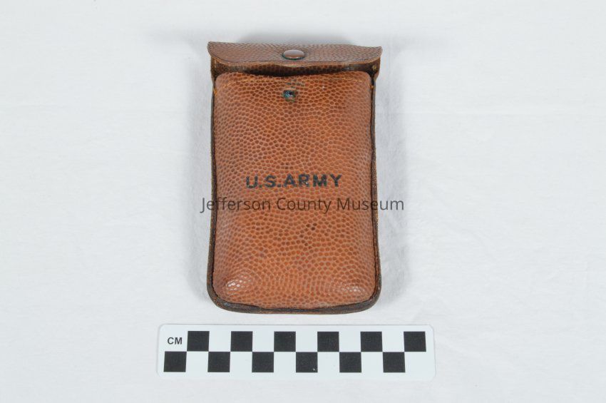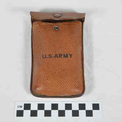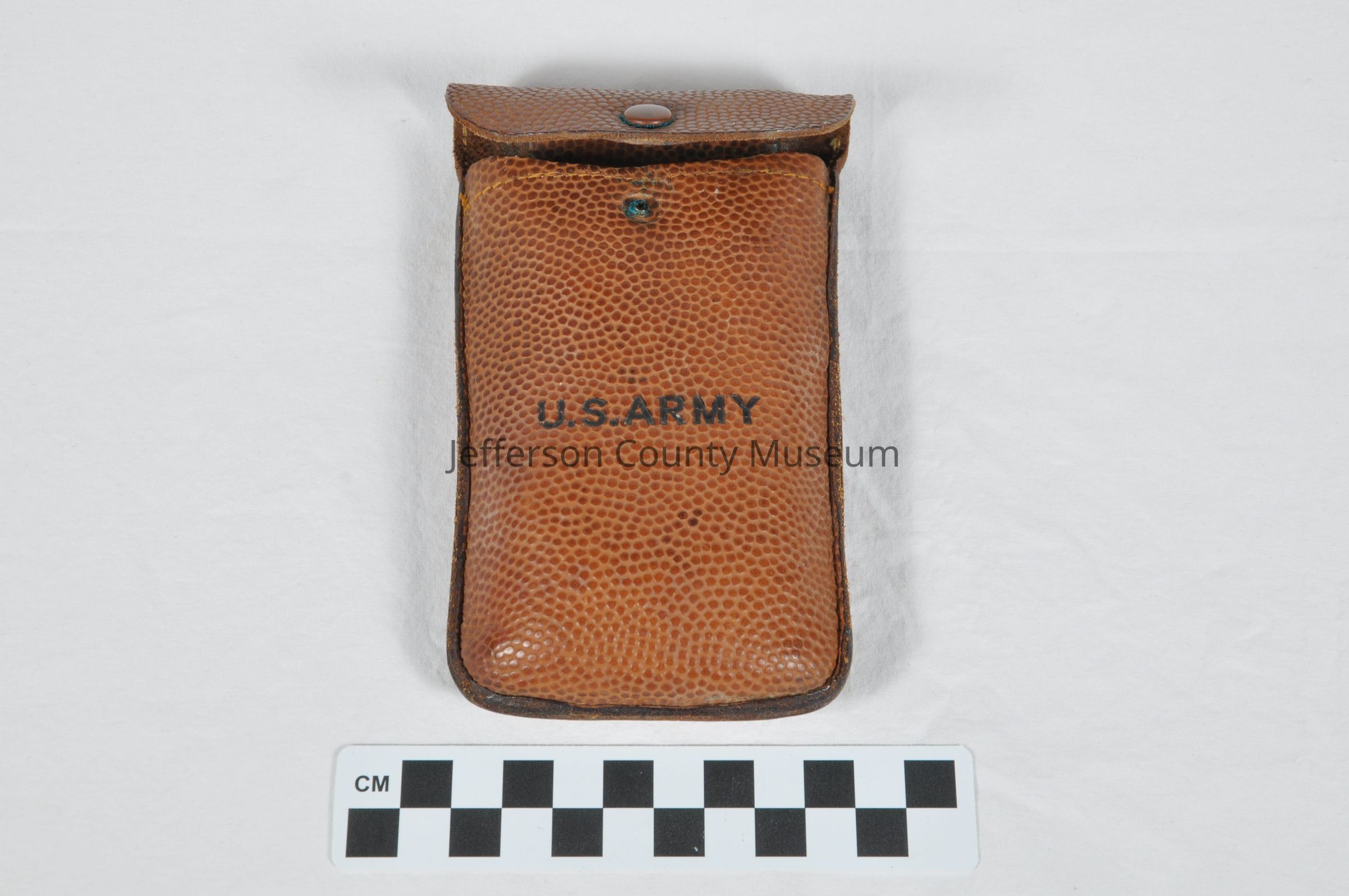 Brown, pebbled leather case for map viewer catalog #641. Snap closure. "U. S. ARMY" on front.