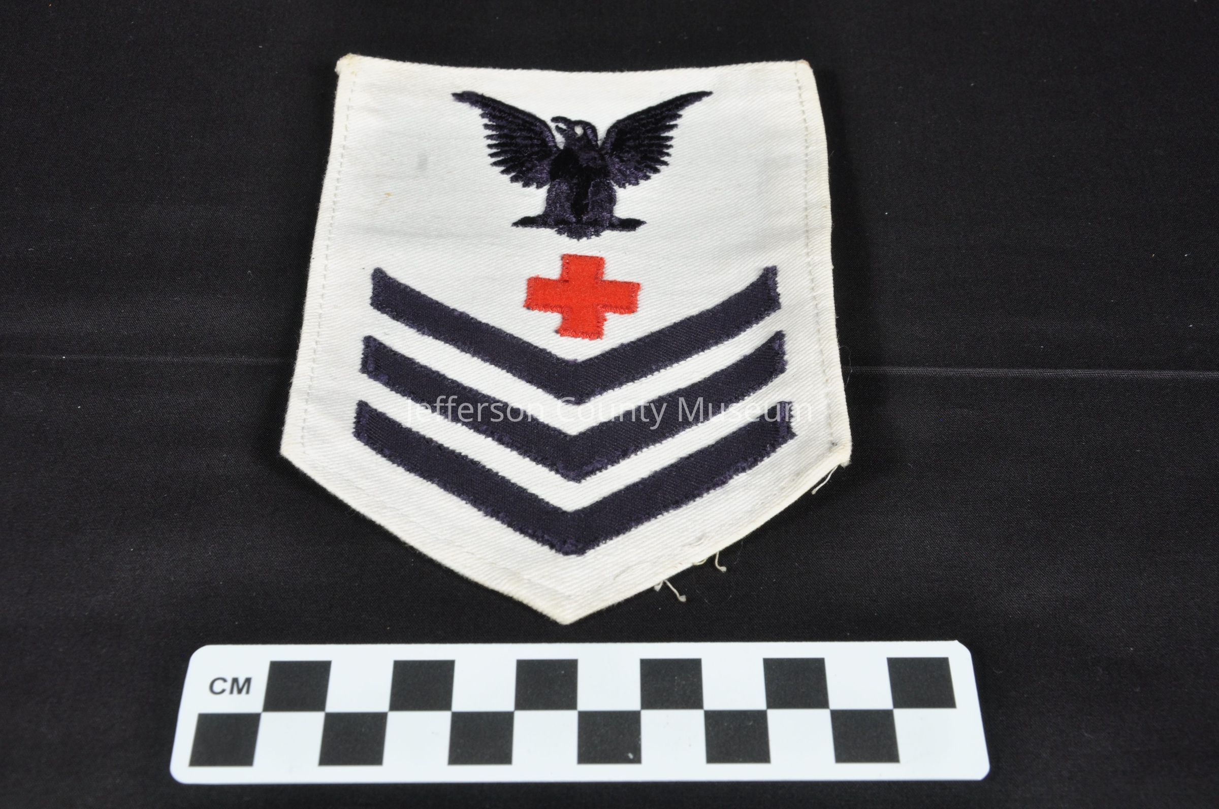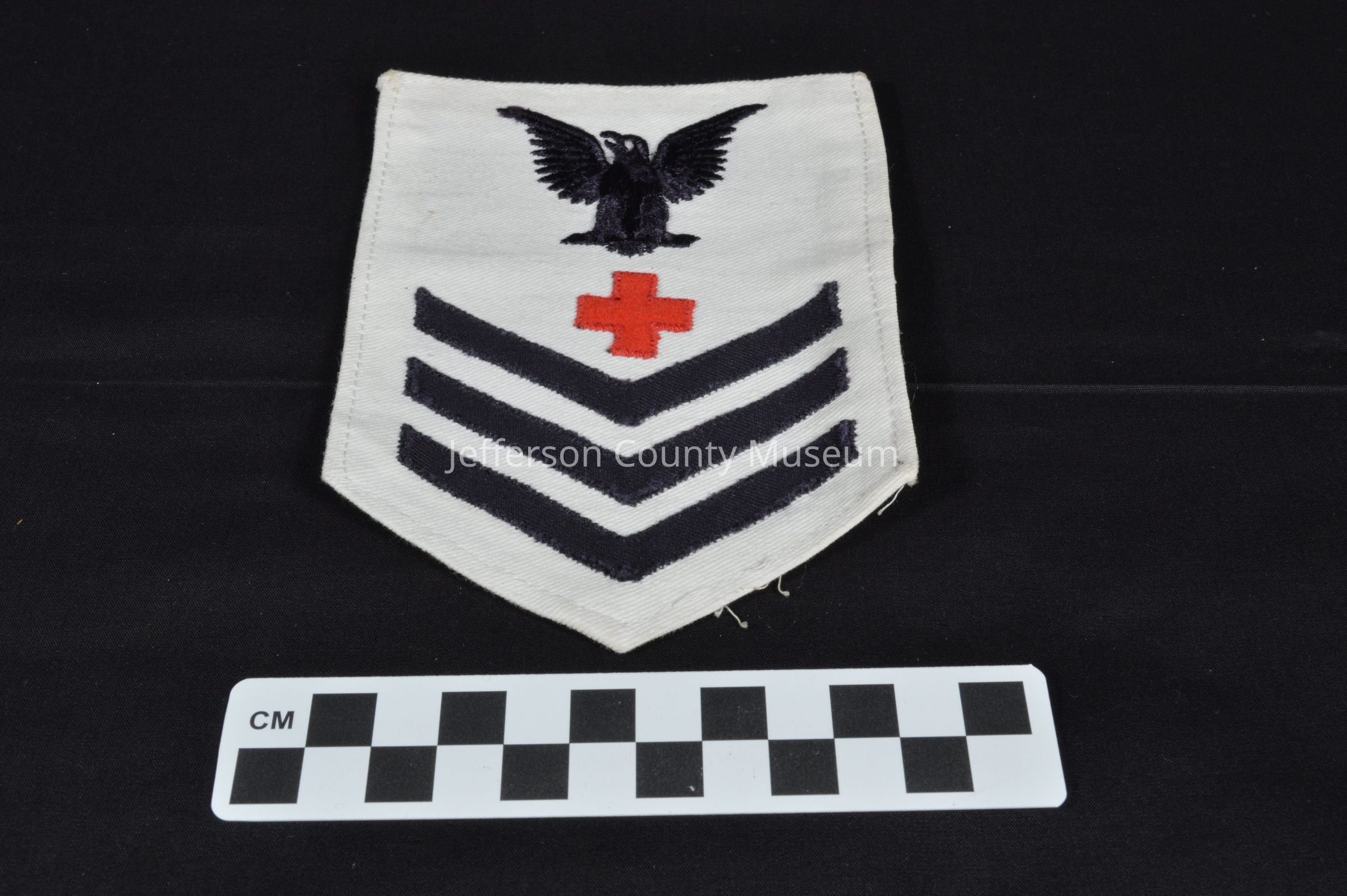 White U.S. Navy hospital corps 3 stripe patch with red cross and eagle above. Stripes and eagle are dark blue. Sewn into reverse "1943".Acquisition