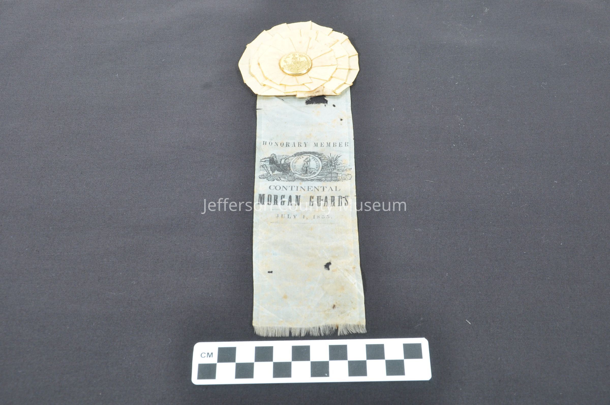 Light blue silk ribbon with round off white ribbon at top with bright brass button in center. Button has state seal of Virginia on it. State seal of Virginia in center with eagle, cornucopia and other symbols of agriculture and industry. Words are "HONORARY MEMBER CONTINENTAL MORGAN GUARDS JULY 4, 1855".Acquisition