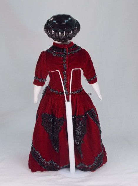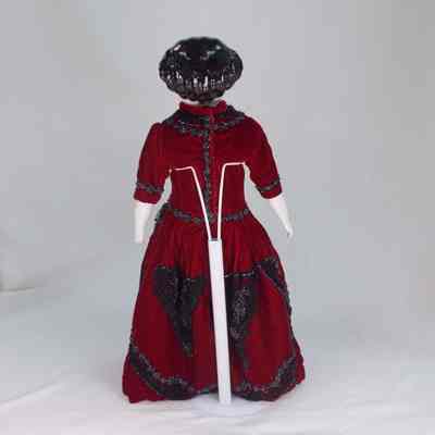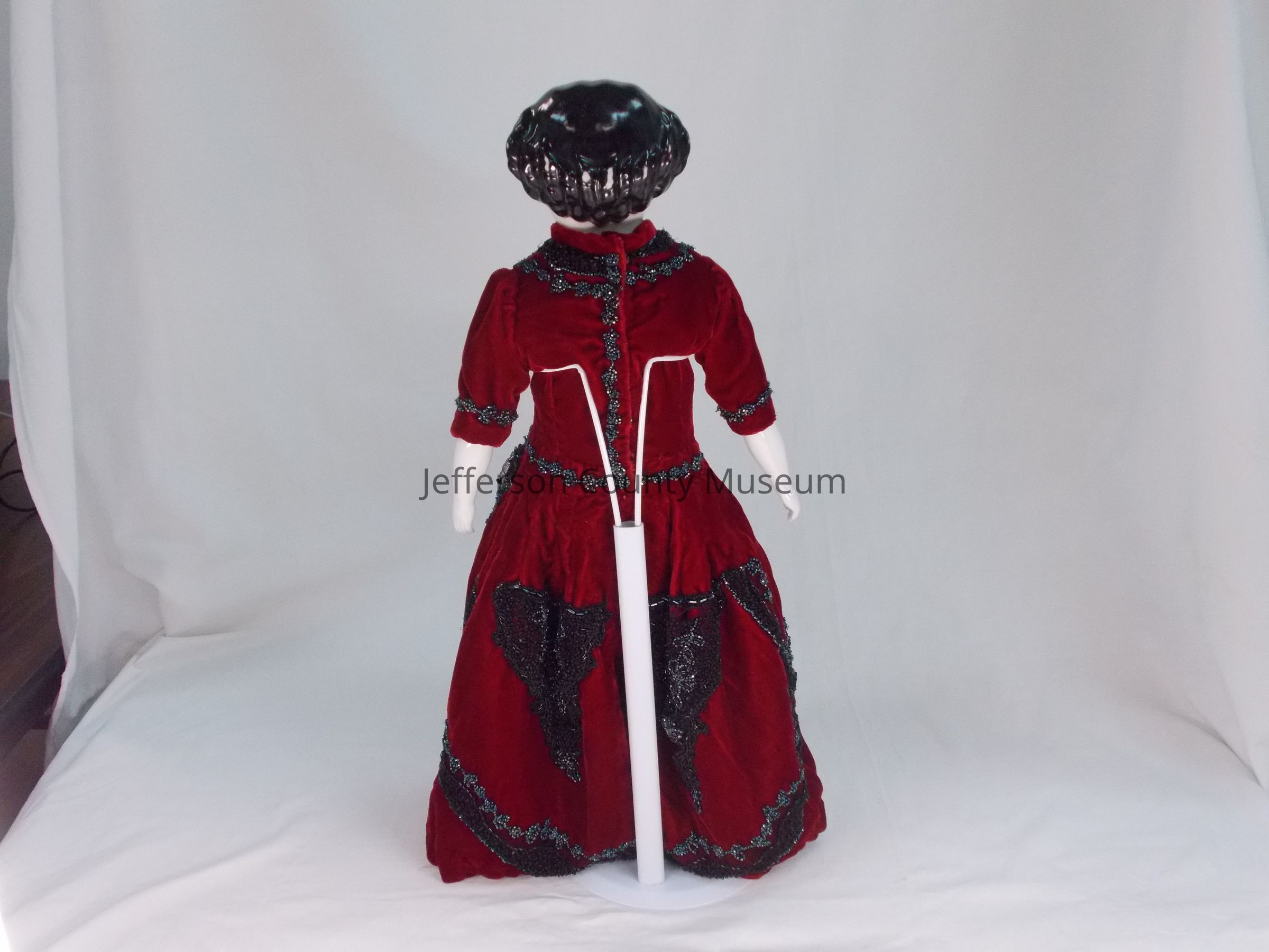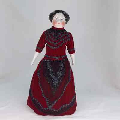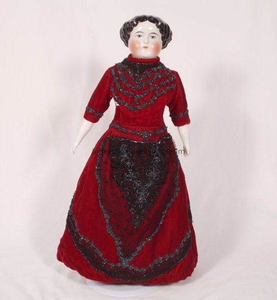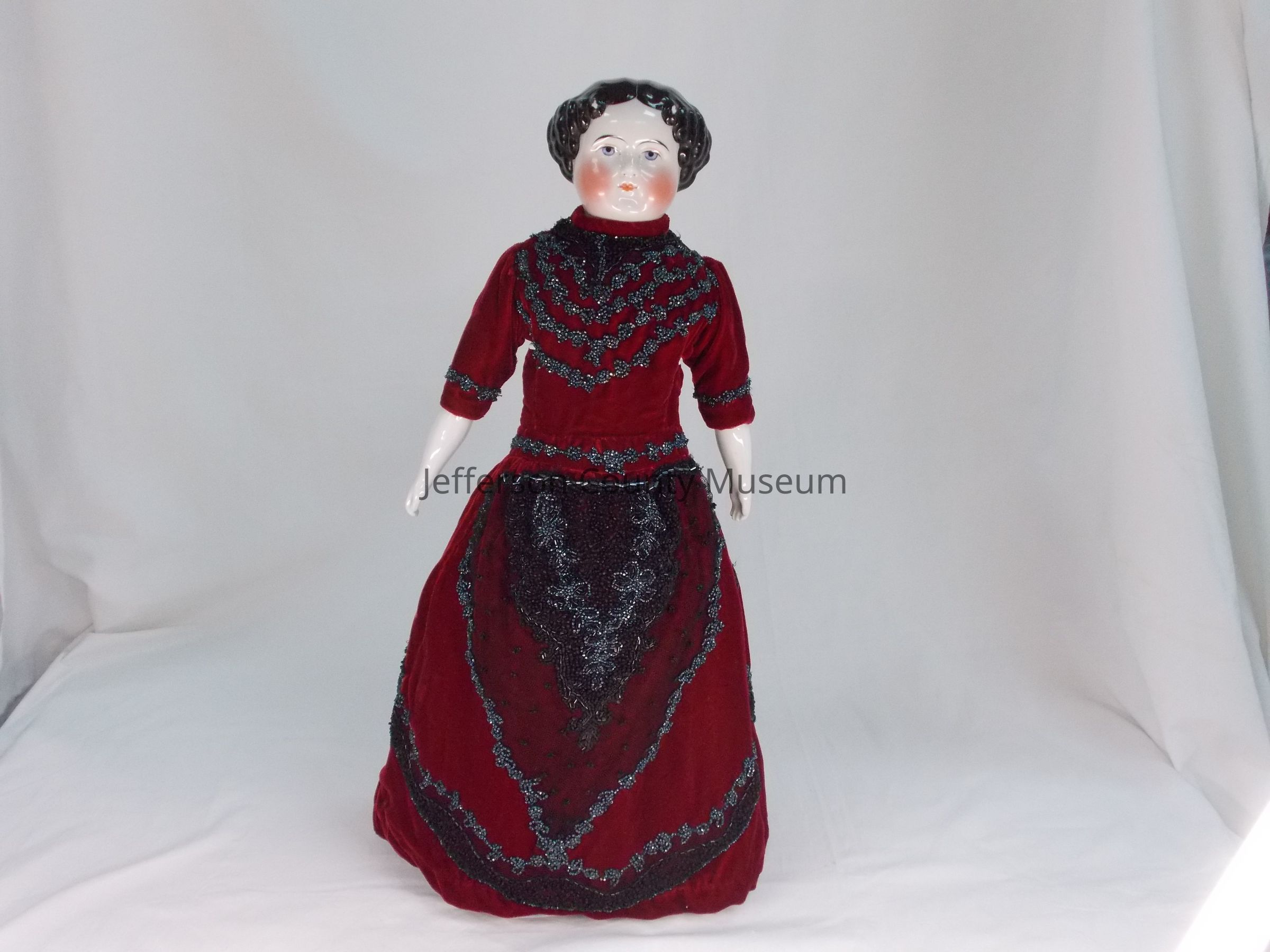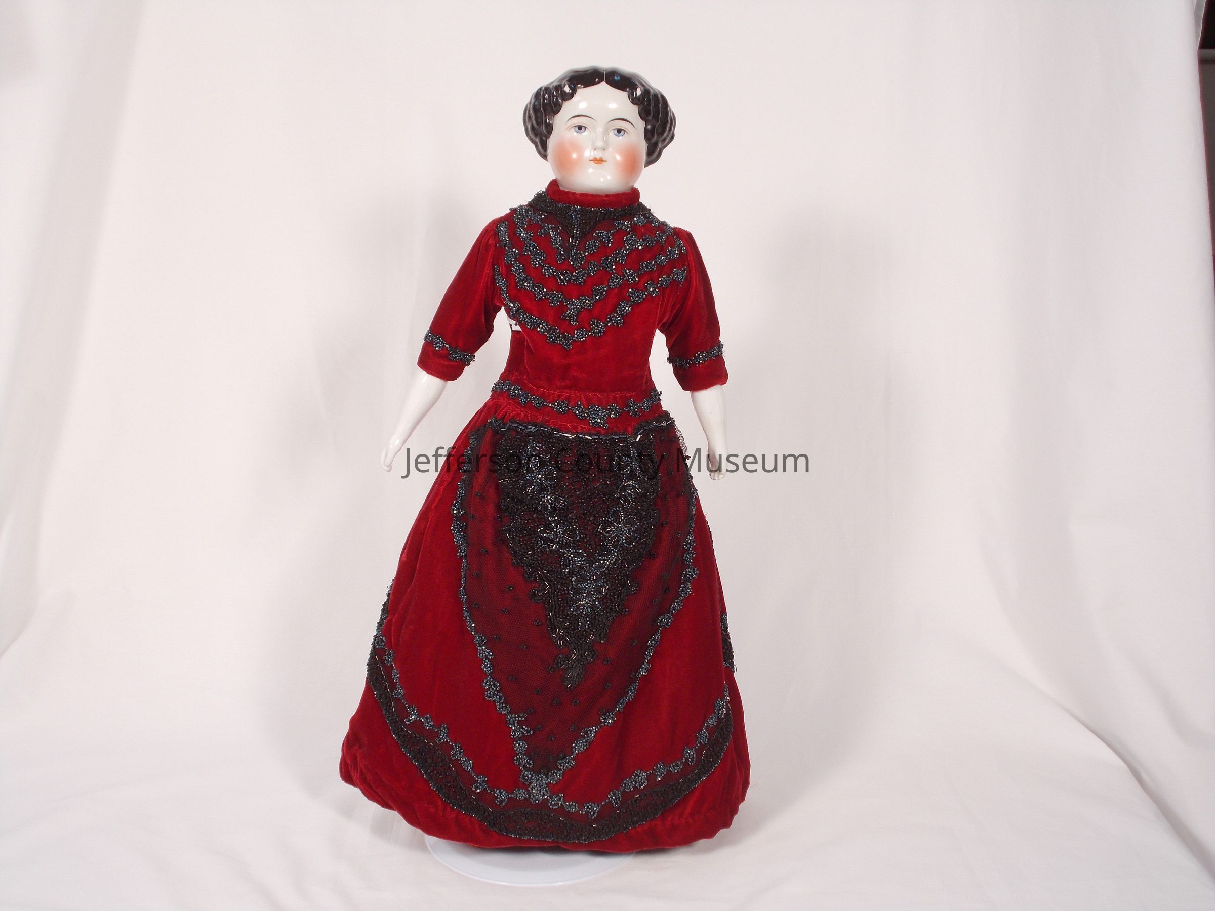 China-head female doll with china arms is wearing a non-original red velvet dress decorated with black and blue beads,several slips, and faded red leather shoes.Acquisition
