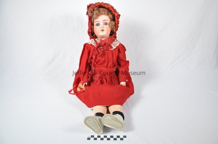 German bisque-head female doll with swivel head with medium-brown mohair wig, blue sleep eyes, and four teeth. Composition and wood body dressed in red cotton dress, silk bonnet, bloomers, white shoes, black socks, and bag. Holes in bottom of feet for stand. Marked on back of neck under wig is "G&S Germany" (Gans and Seyfarth). G&S manufactured ball-jointed dolls from 1910 to 1925.Acquisition