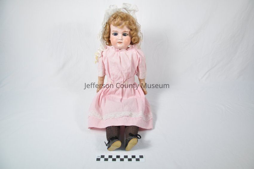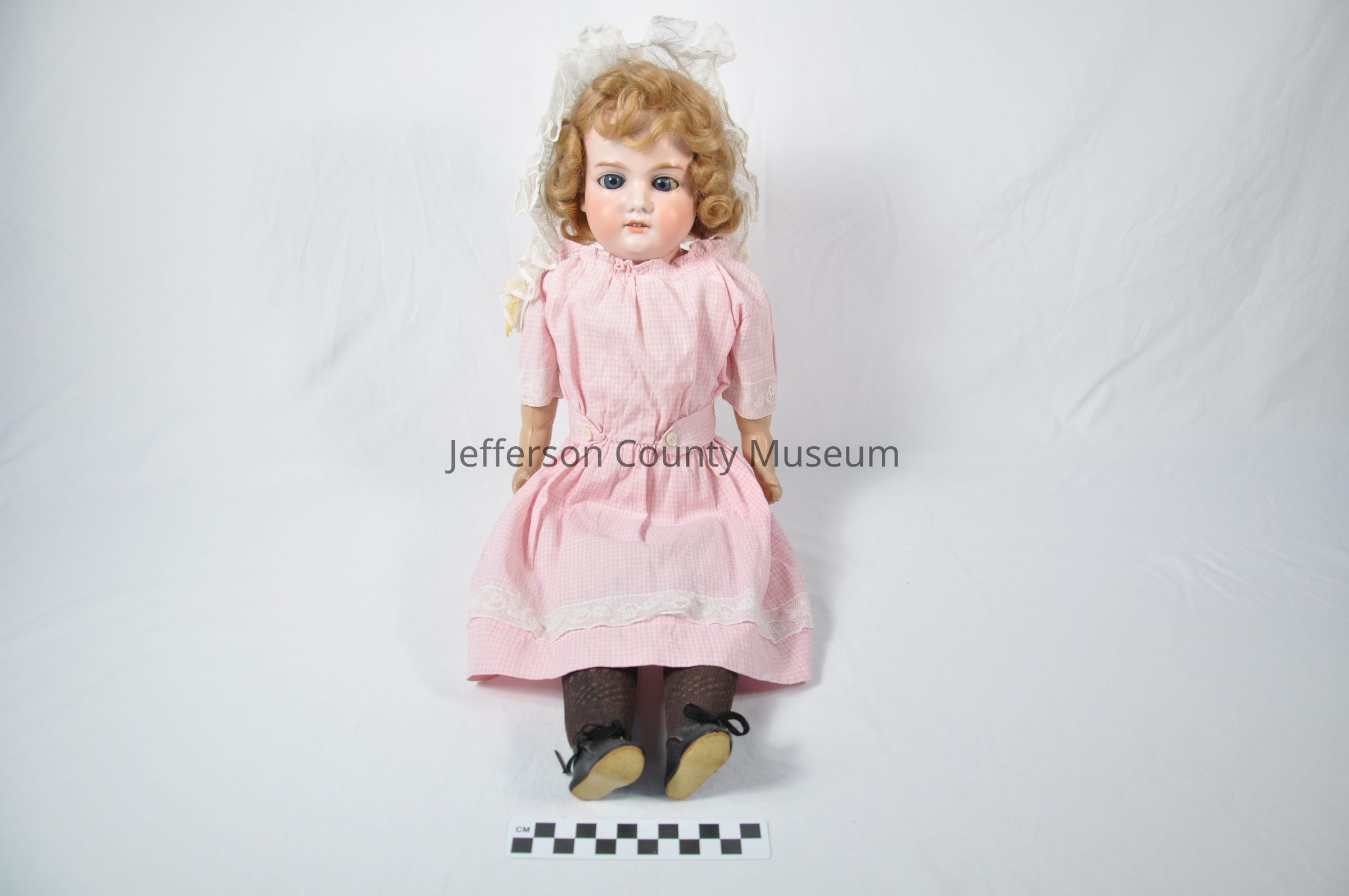 German bisque-head and shoulder-plate female doll with blue sleep eyes, blonde to light brown mohair wig, open mouth with teeth, cloth body and legs, composition upper arms, black patent tie shoes sewn on, pink lace-trimmed checked cotton dress, original pink slip and matching bloomers,and lace bonnet. Legs may be replacements. Made in Germany by Armand Marseille, 1919-1920. Marked "370 A.M. 4, D.E.P."Acquisition