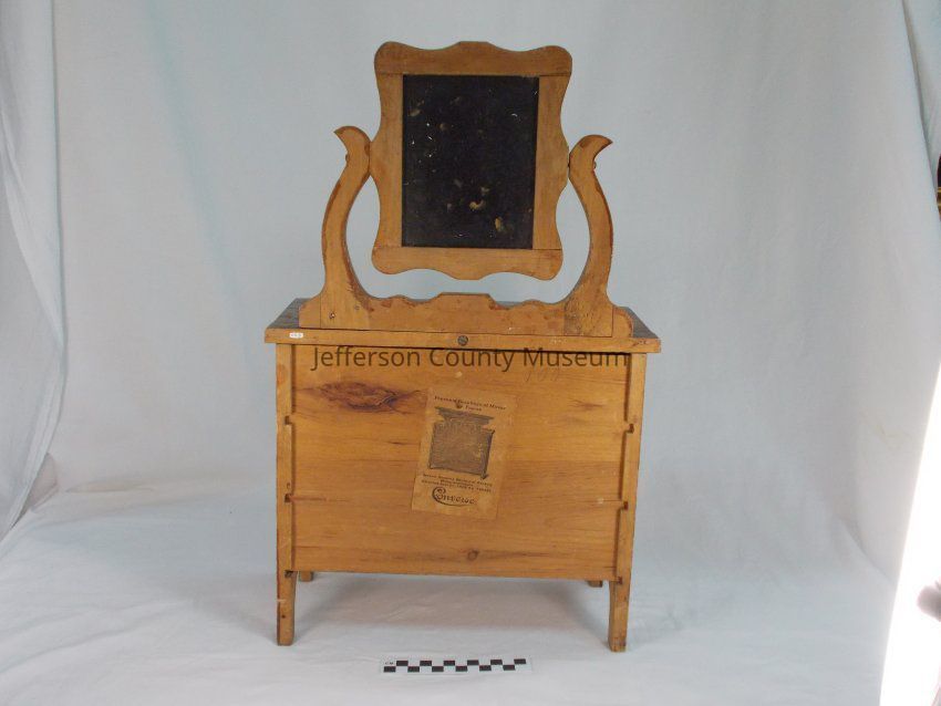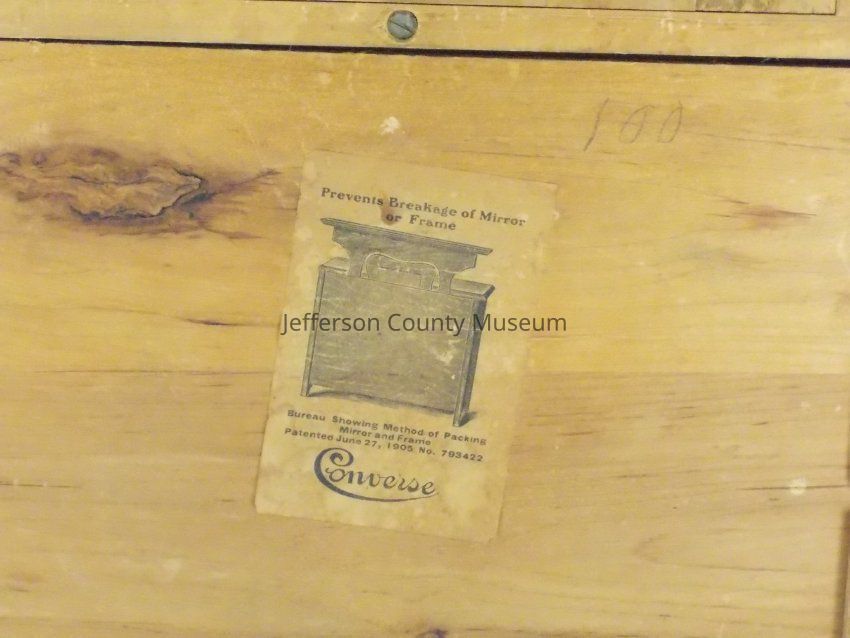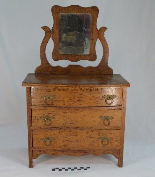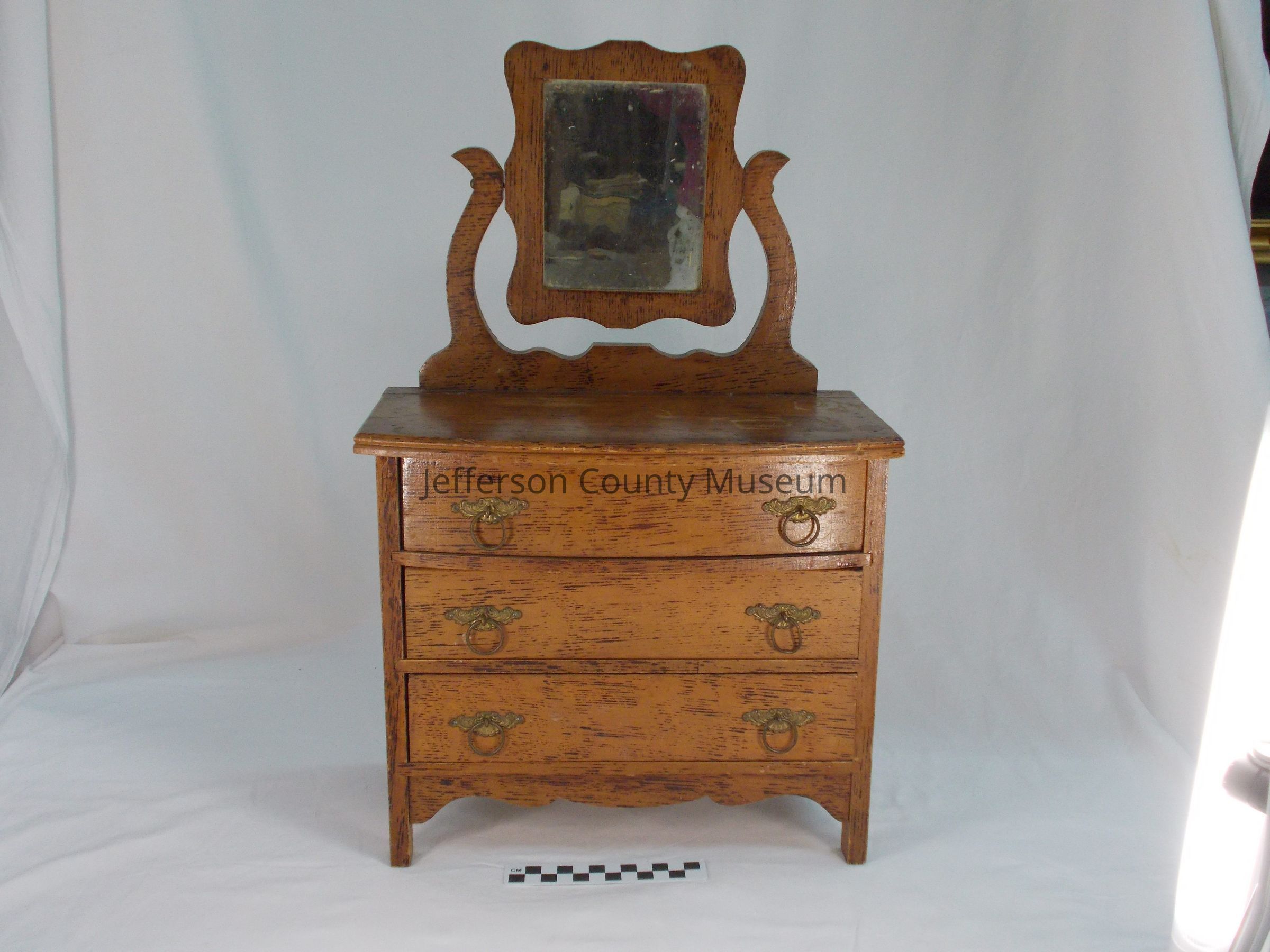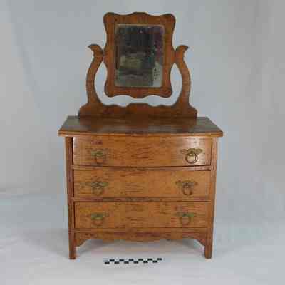Three drawer wooden doll dresser. Has mirror with wood frame on top. Brass ring pulls on front of drawers. Top drawer has slightly bowed front. Label on back has illustration of how to pack mirror and frame. Label says "Prevents Breakage of Mirror or Frame Bureau Showing Method of Packing Mirror and Frame Patented June 27, 1905 No. 793422 Converse".Acquisition