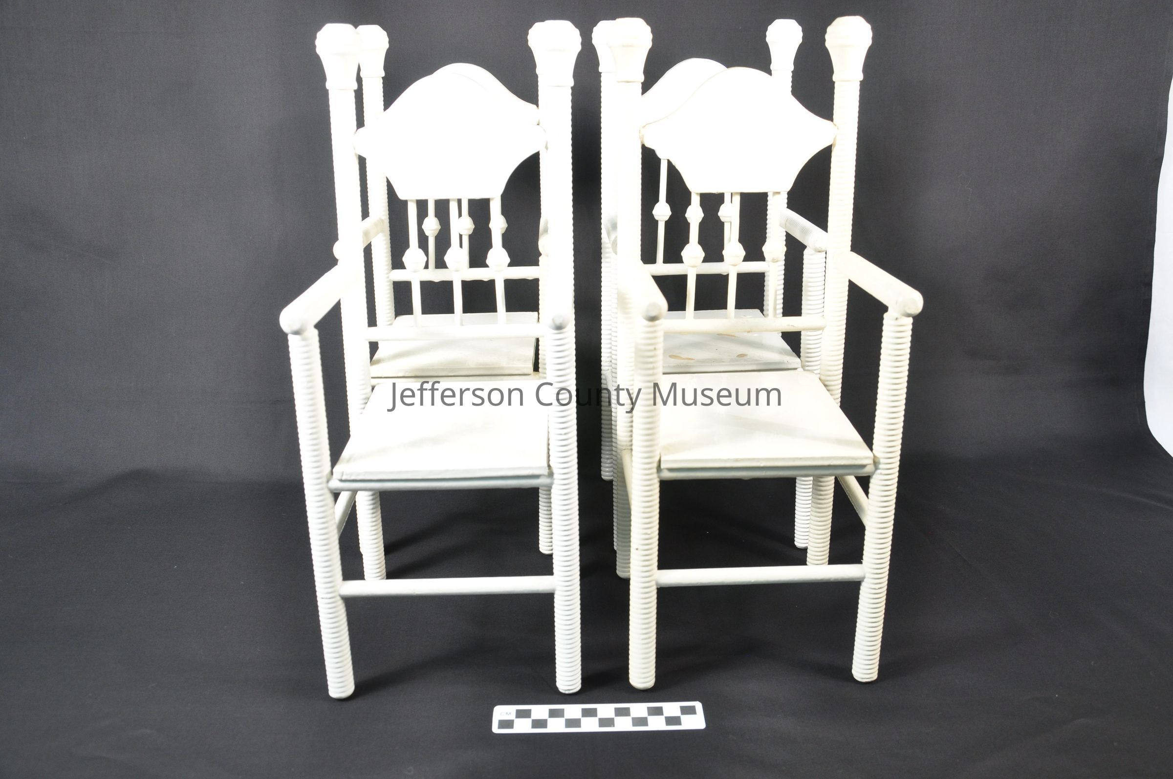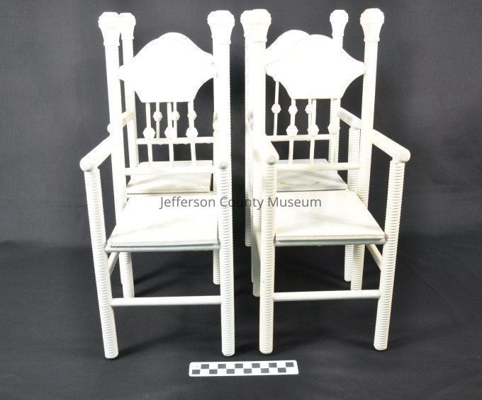 Four white painted straight chairs for a doll. Three rungs on back, spindle legs front and back. Back legs continue above back and are capped with large finial.Acquisition