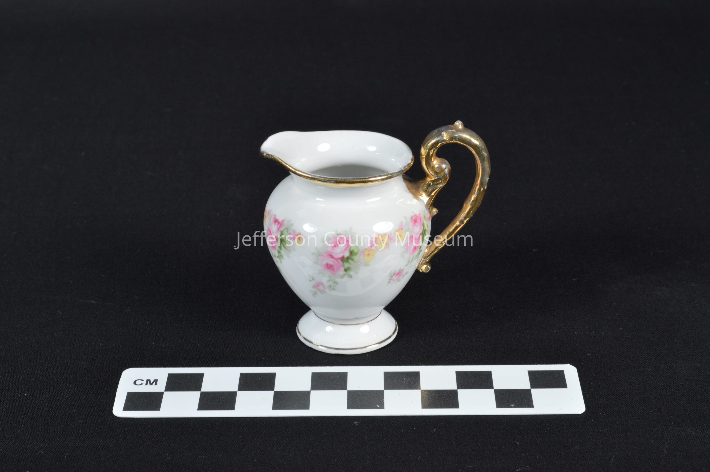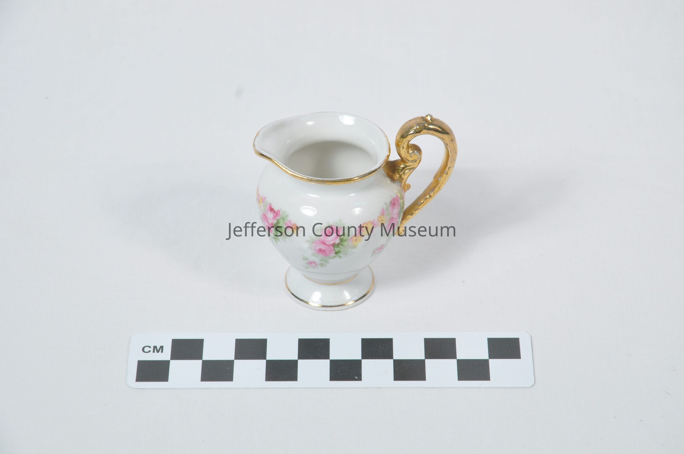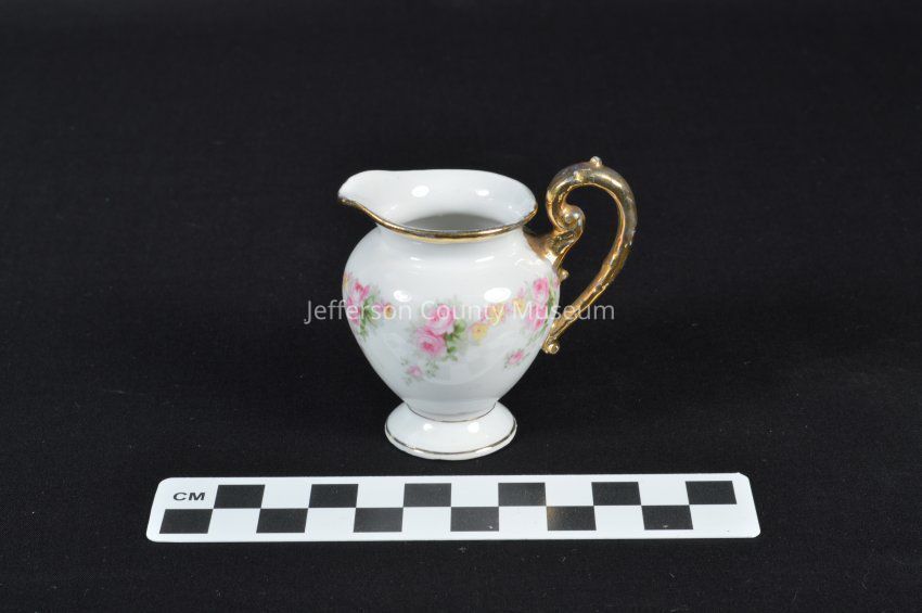 Pink flowered china pitcher with gold handle and gold trimmed. Made for children.