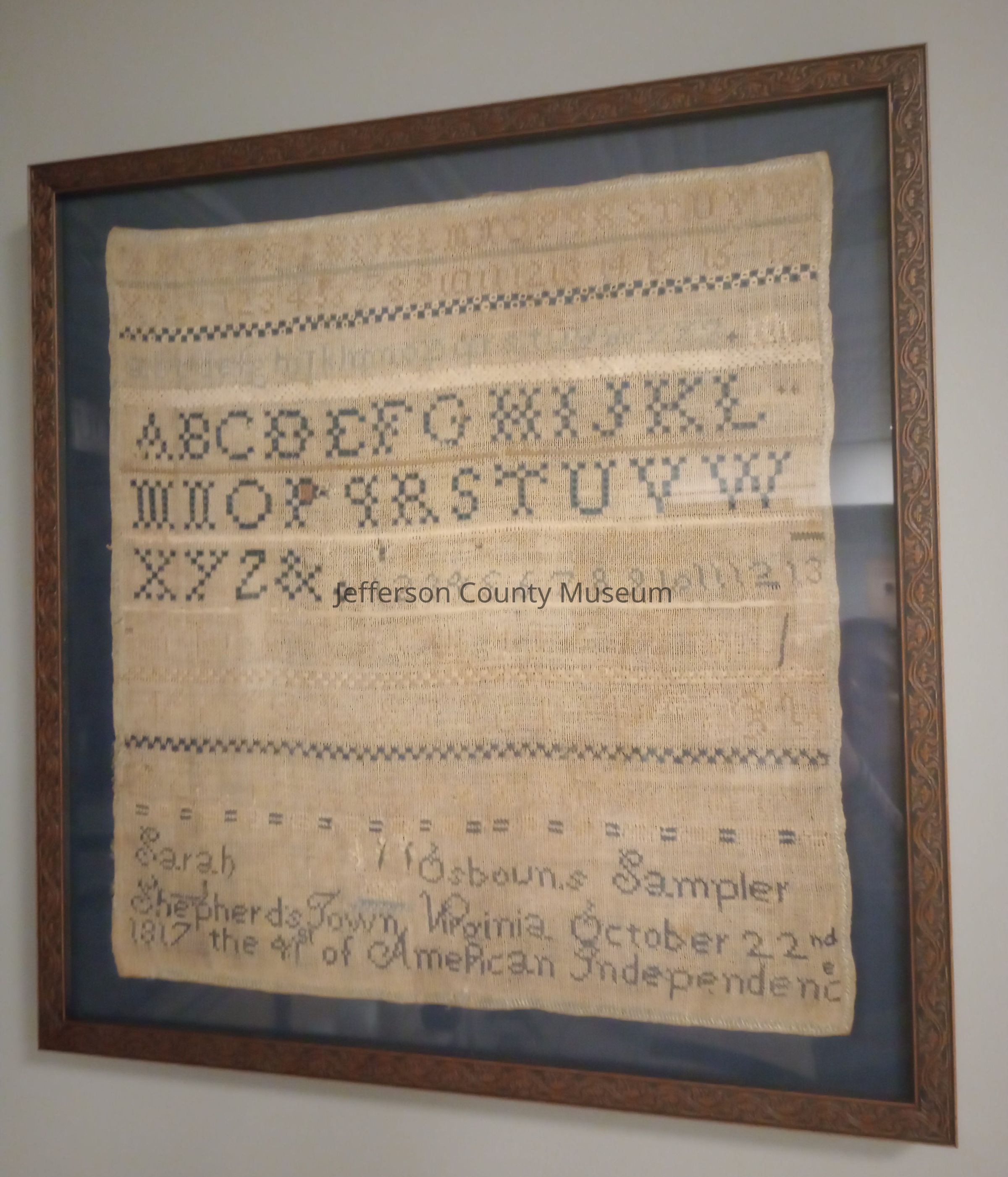 Framed mounted sampler created by Shepherdstown resident Sarah Osbourn. Sampler includes rows of hand emproidered alphabets in different cases and fonts, as well as numbers, patterns and a an embroidered image near the bottom that looks like a bowl of flowers (which has green and pink threads). Thread is mostly light, blue, dark blue, and colors that have faded into various shades of beige. At the bottom is embroidered "Sarah Osbouns Sampler / Shepherd's Town Virginia October 22nd / 1817 the 41st of AmeRcan Independence"Context