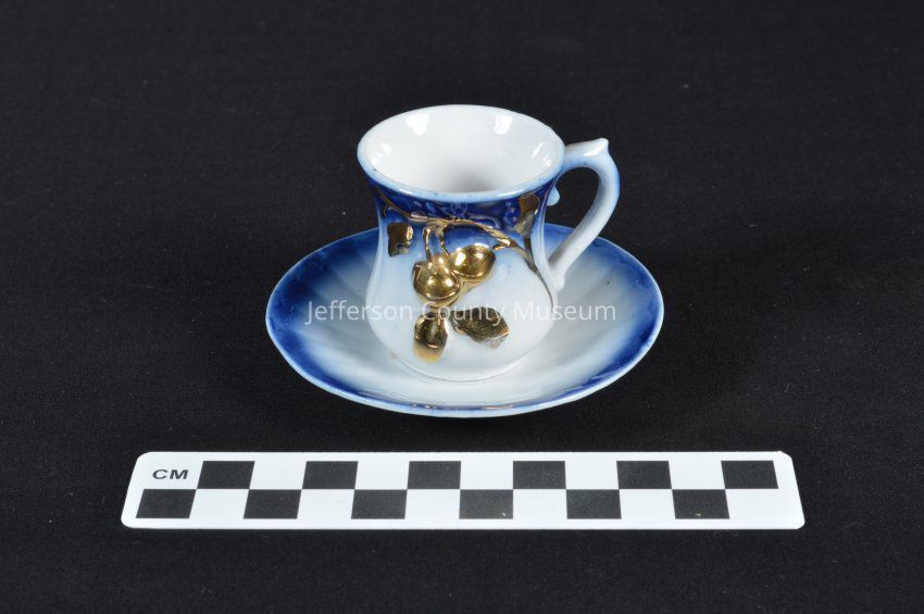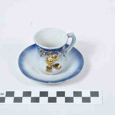 Cup and saucer made for child's play. Blue around top of cup. Saucer has blue on outer edge with gold trim leaves and fruit.Acquisition