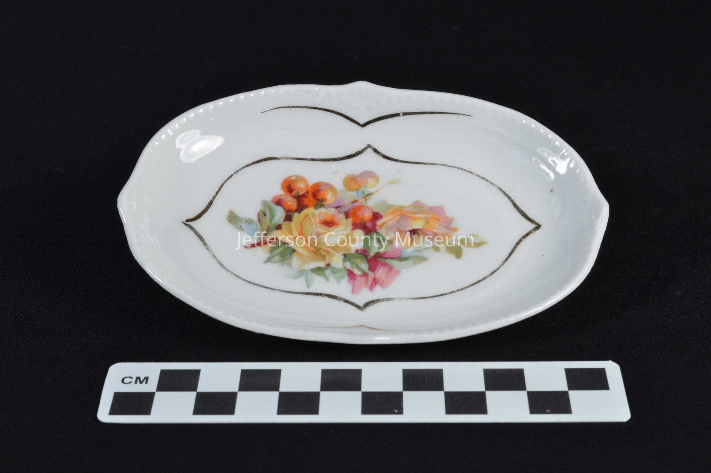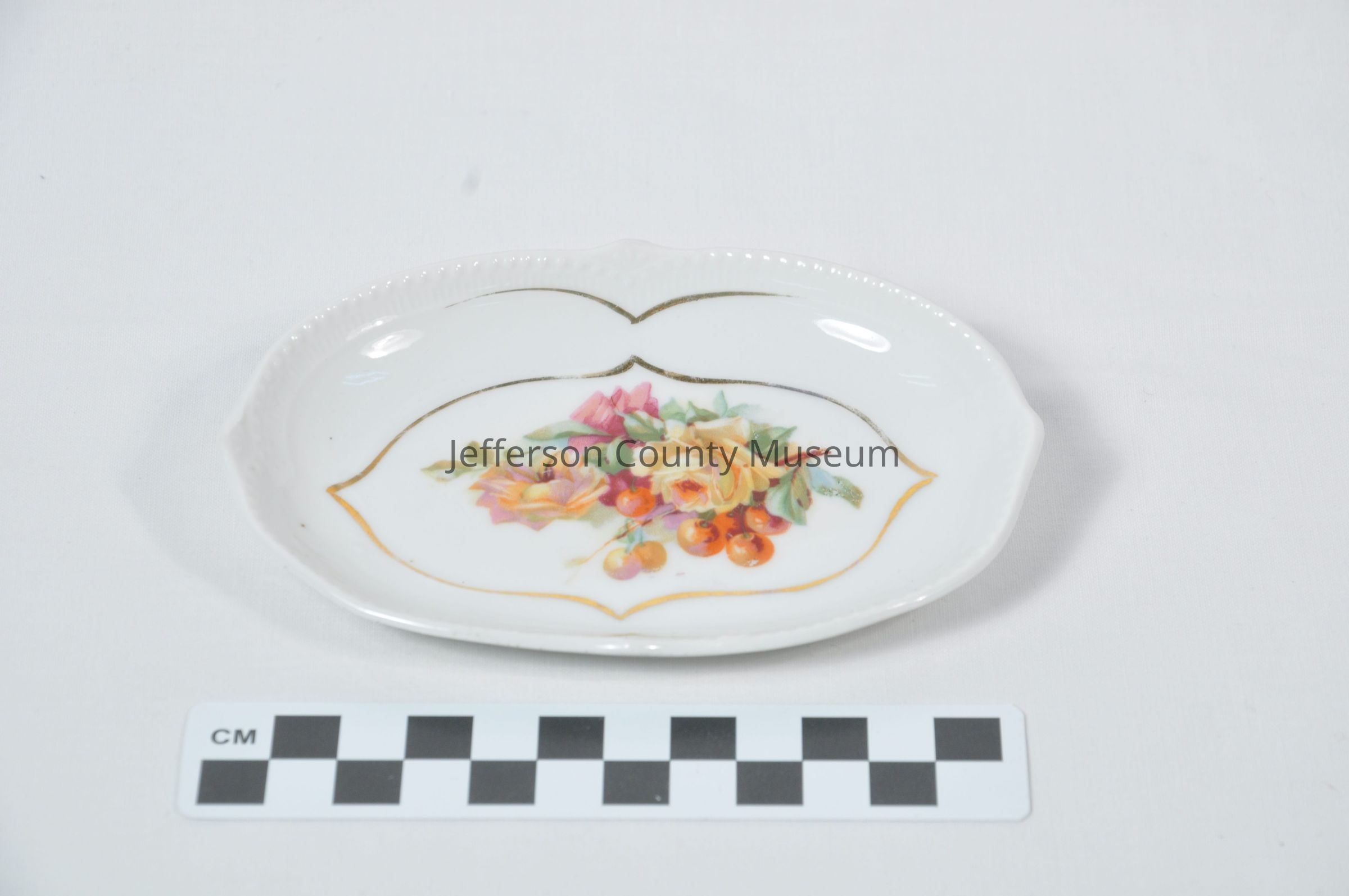 China platter made for child's play. Roses and fruit painted on platter. Also has gold trim.