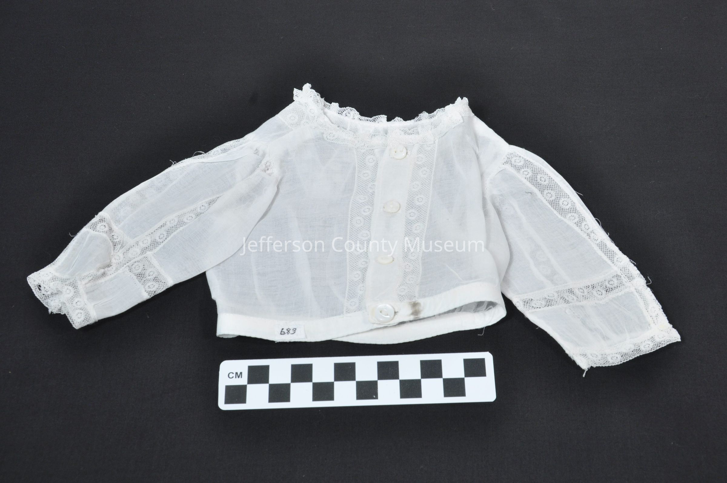 White cotton blouse made for a doll. There is lace around collar, below collar on front and down sleeves. Four buttons on back.Acquisition
