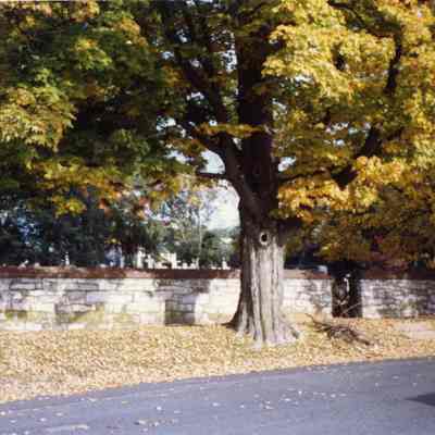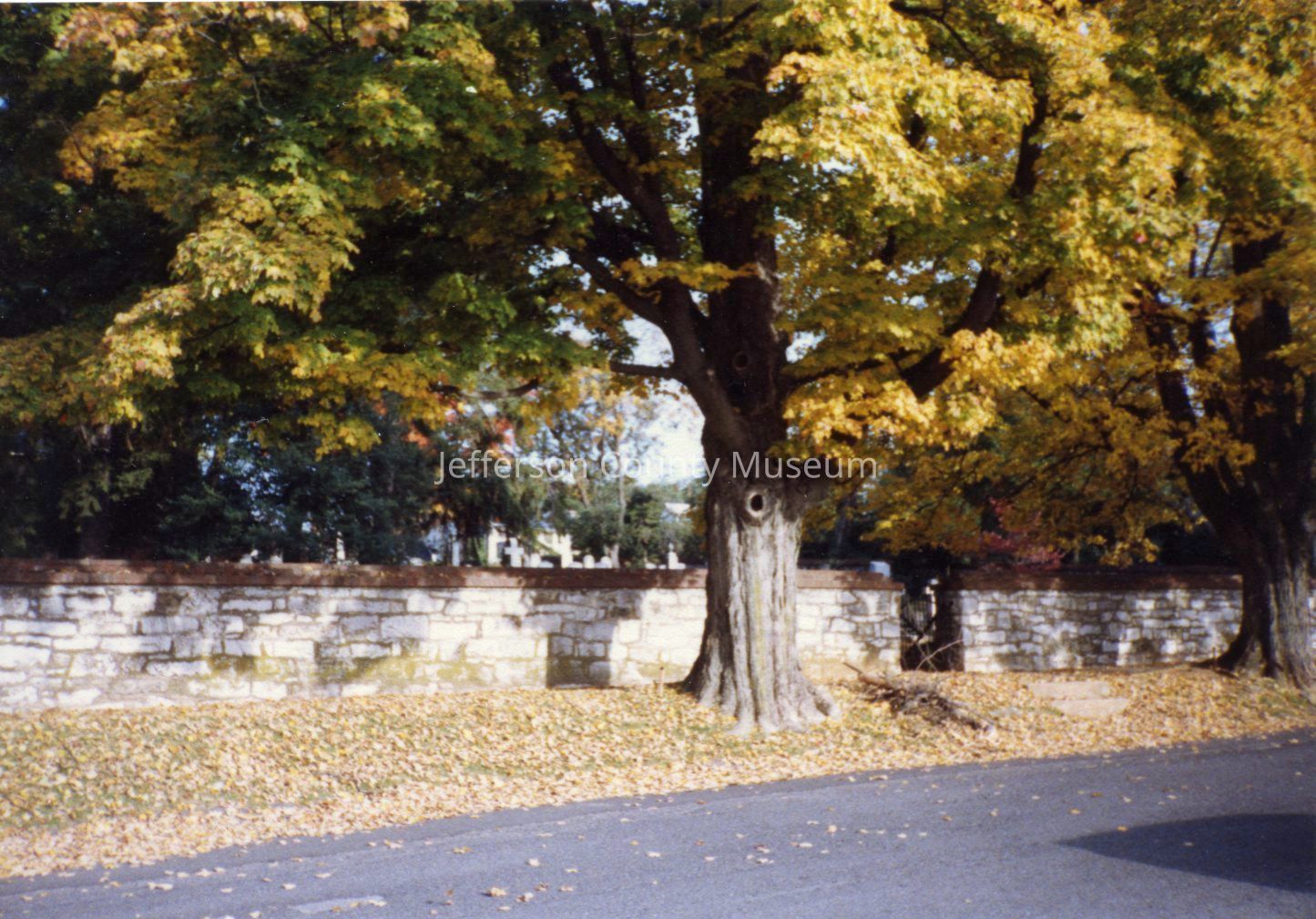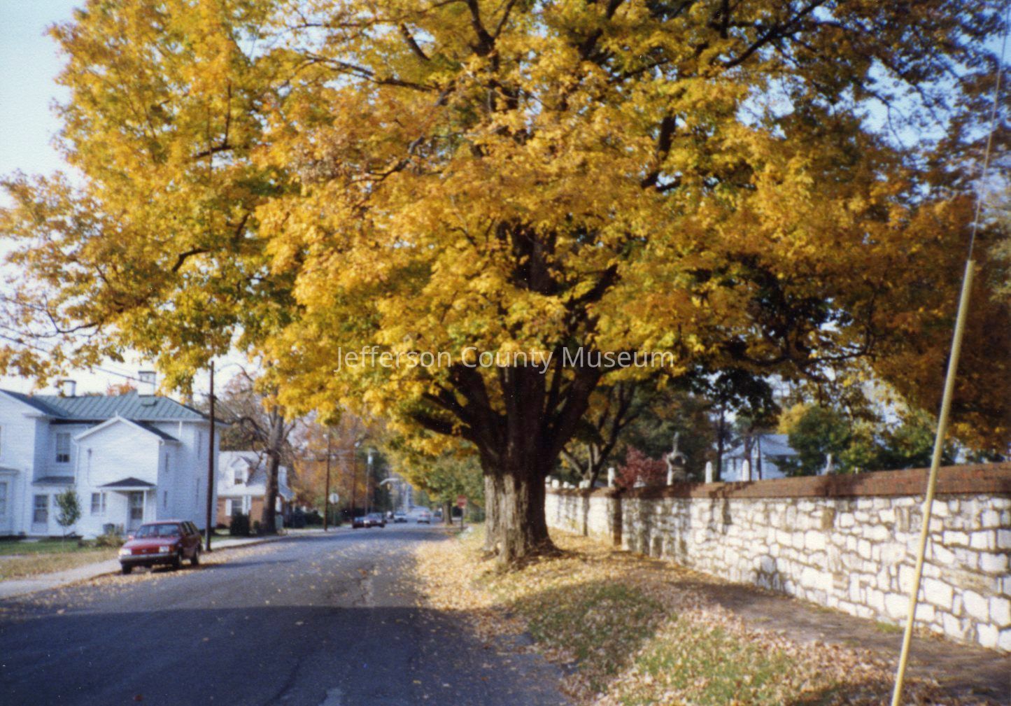 The 200 block of South Mildred Street looking north. The rear elevation of Captain George Baylor's house is seen on the left. The stone wall surrounding the Zion Episcopal Church cemetery is on the right.Acquisition