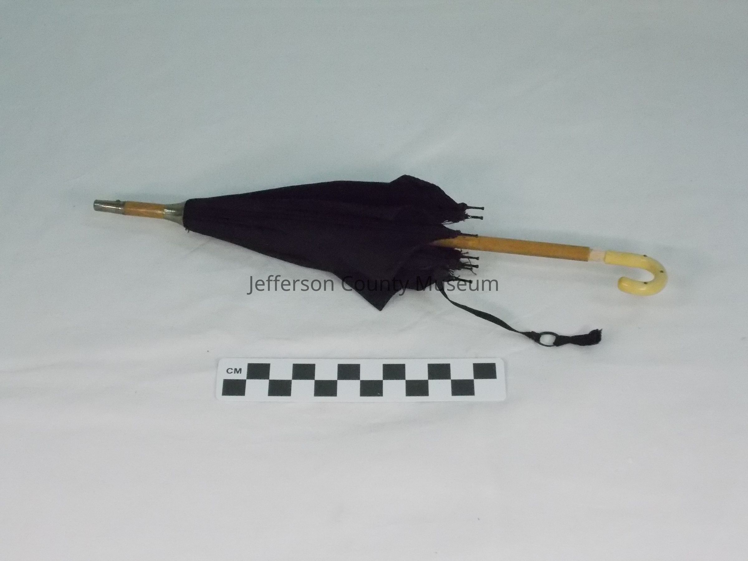 Doll umbrella, black cotton, wood handle with bone crook. Opens.