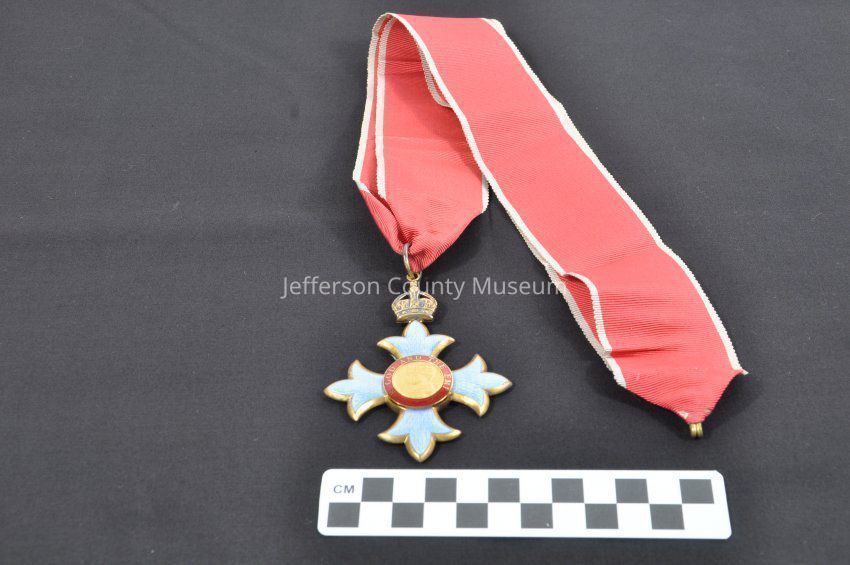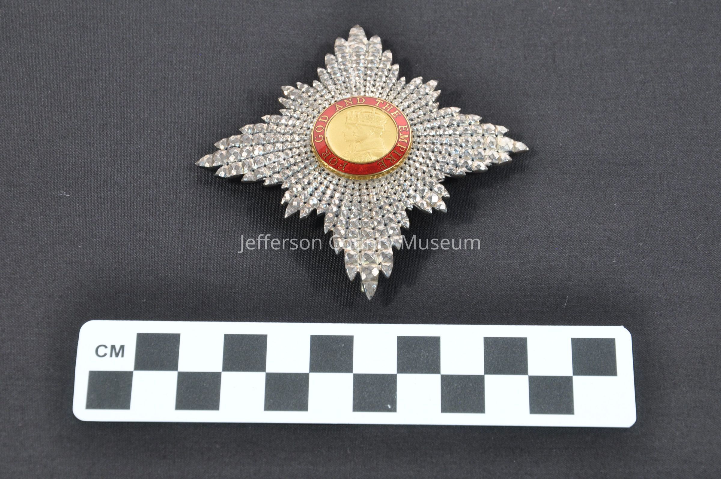 Medal (a) and star (b) of a Knight Commander Order of the British Empire. Medal has a red ribbon with white border. Consists of Yellow metal with blue and red enamel. Profiles of King George V and Queen Mary in center. Around profiles "FOR GOD AND THE EMPIRE". Order is star-shaped and made of faceted silver colored metal. Center has profiles of King George and Queen Mary. Around profiles "FOR GOD AND THE EMPIRE".Acquisition