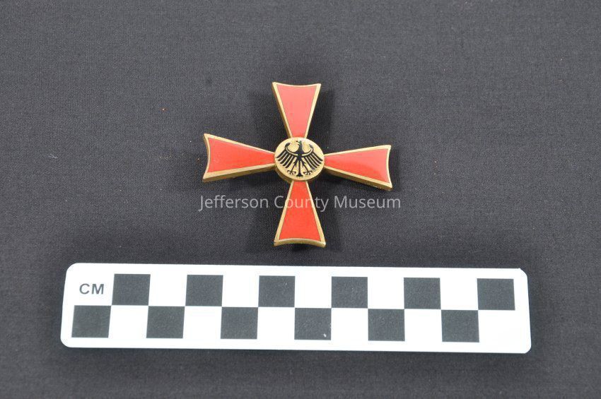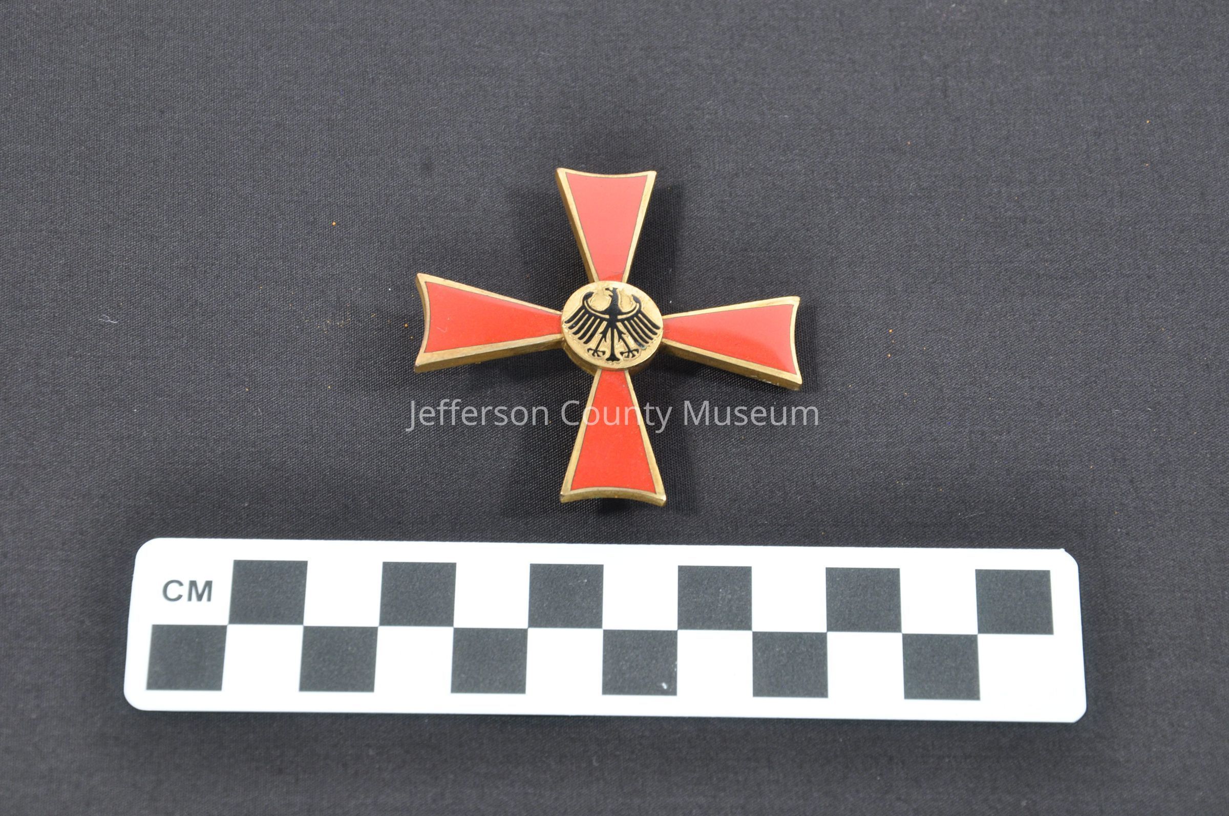 Cross of Merit given to John S. Coleman by the government of West Germany. Yellow metal cross with red enamel. Center is a circle with a black eagle. Framed on blue cloth.Acquisition