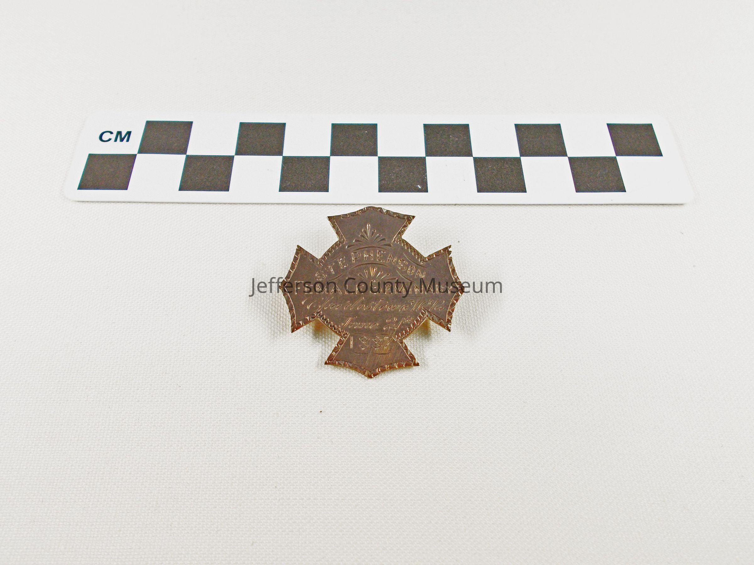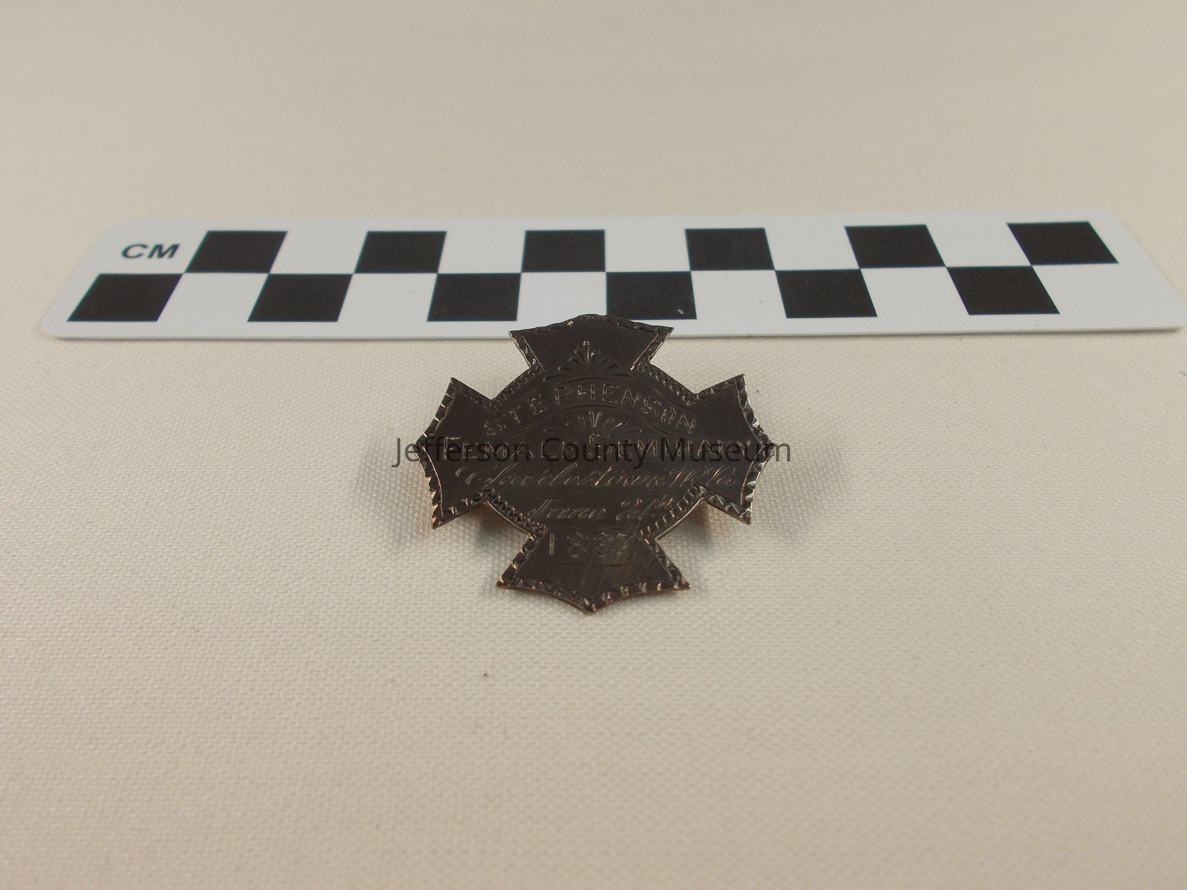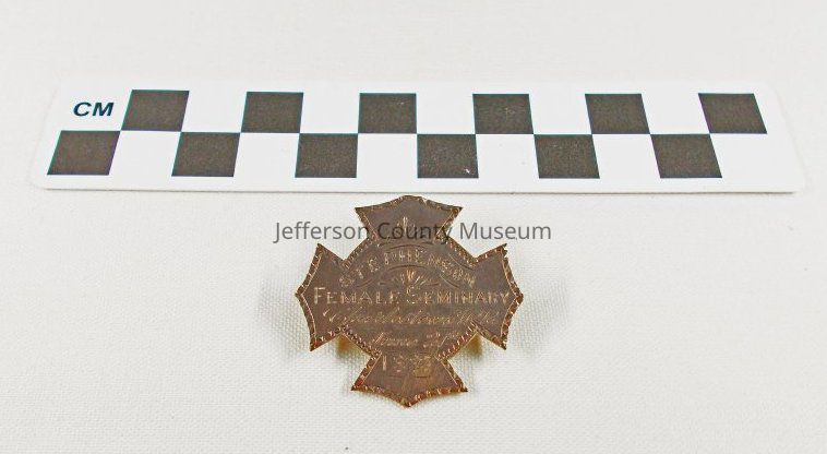 Sterling silver pin in shape of iron cross. Inscribed on front "STEPHENSON FEMALE SEMINARY, Charlestown, WVa. June 21st, 1887". On back "INST. Music Presented by MADAM RUHL".Acquisition