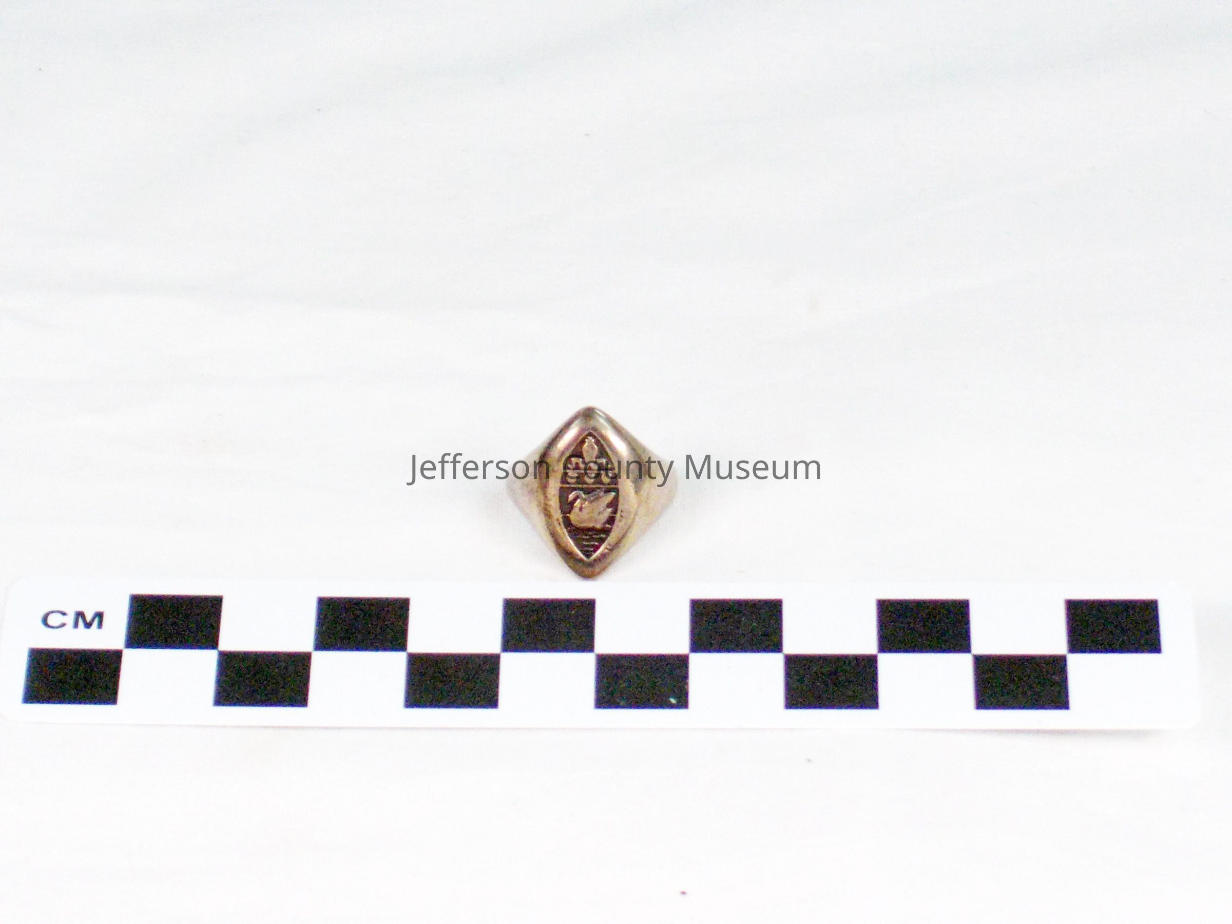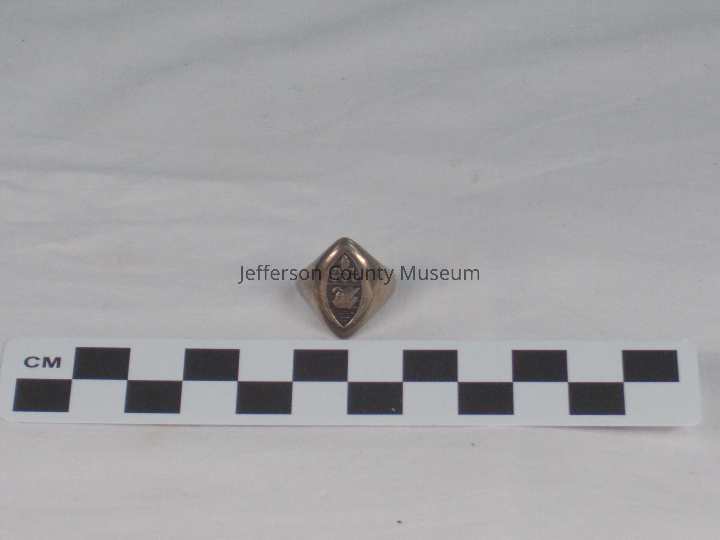 St. Hilda's Hall sterling silver ring with box. Has crest of St. Hilda's, which is a bishop's mitre at top, 3 dots and a swan. "M.B.T." inscribed on inside of ring. "M.B.T." stands for Margaret Beverley Taylor, who was a student at St. Hilda's.Acquisition
