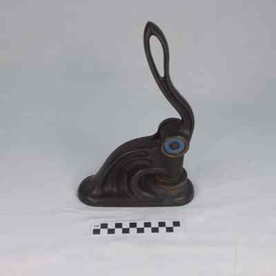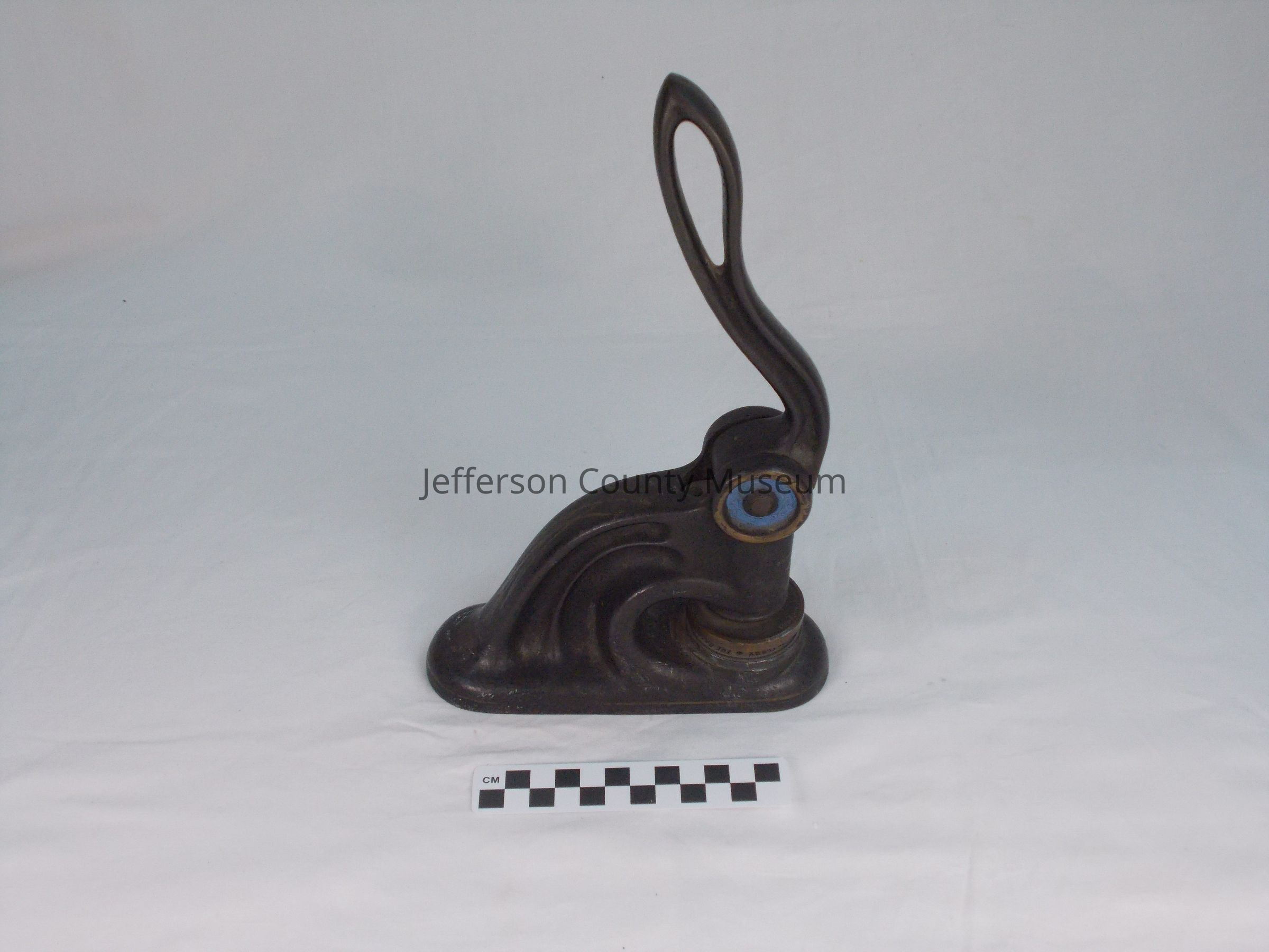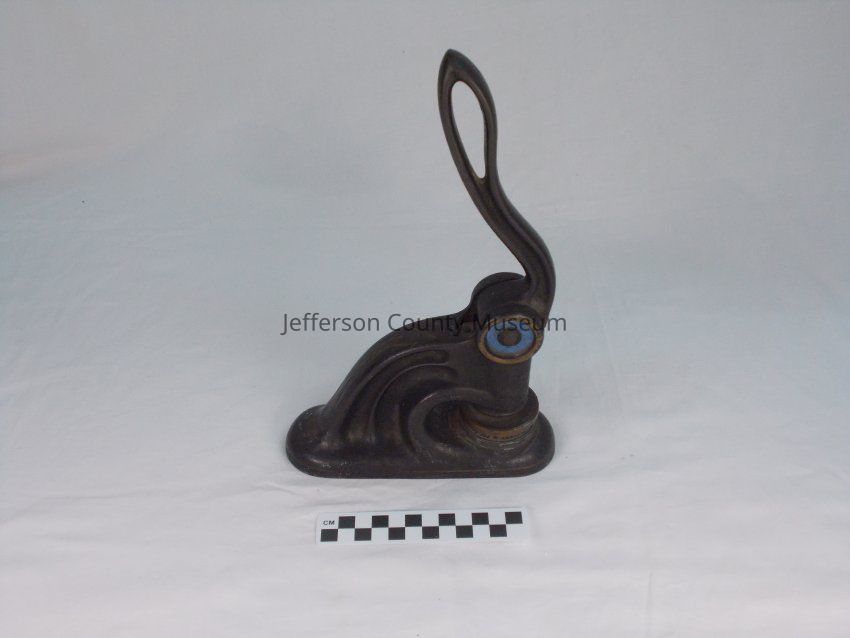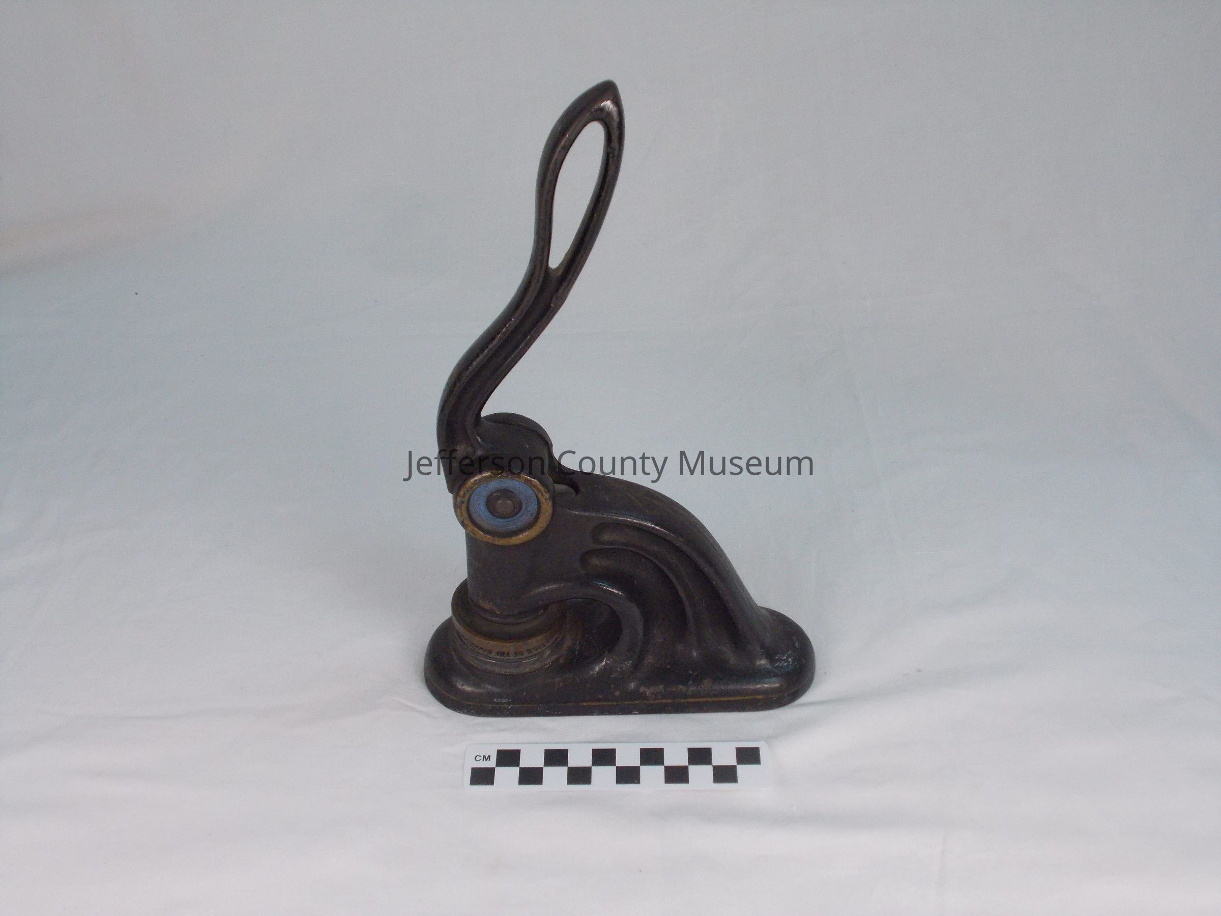 Press for seal of Harpers Ferry High School. Press is painted black with blue and gold decoration around the pivot point of the handle. Has handle with nearly oval shaped holes through it. On front in gold lettering "MADE BY SOUTHERN STAMP & STATIONERY COMPANY, RICHMOND, VA.".Acquisition