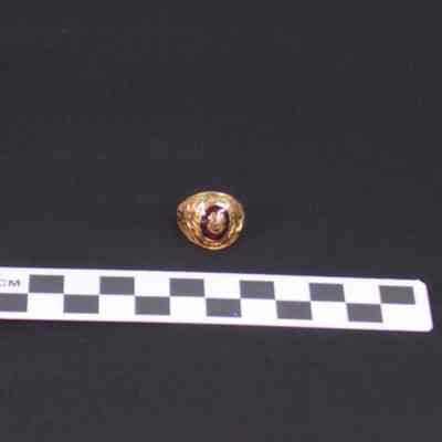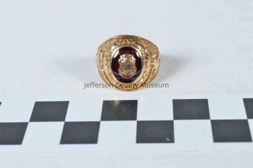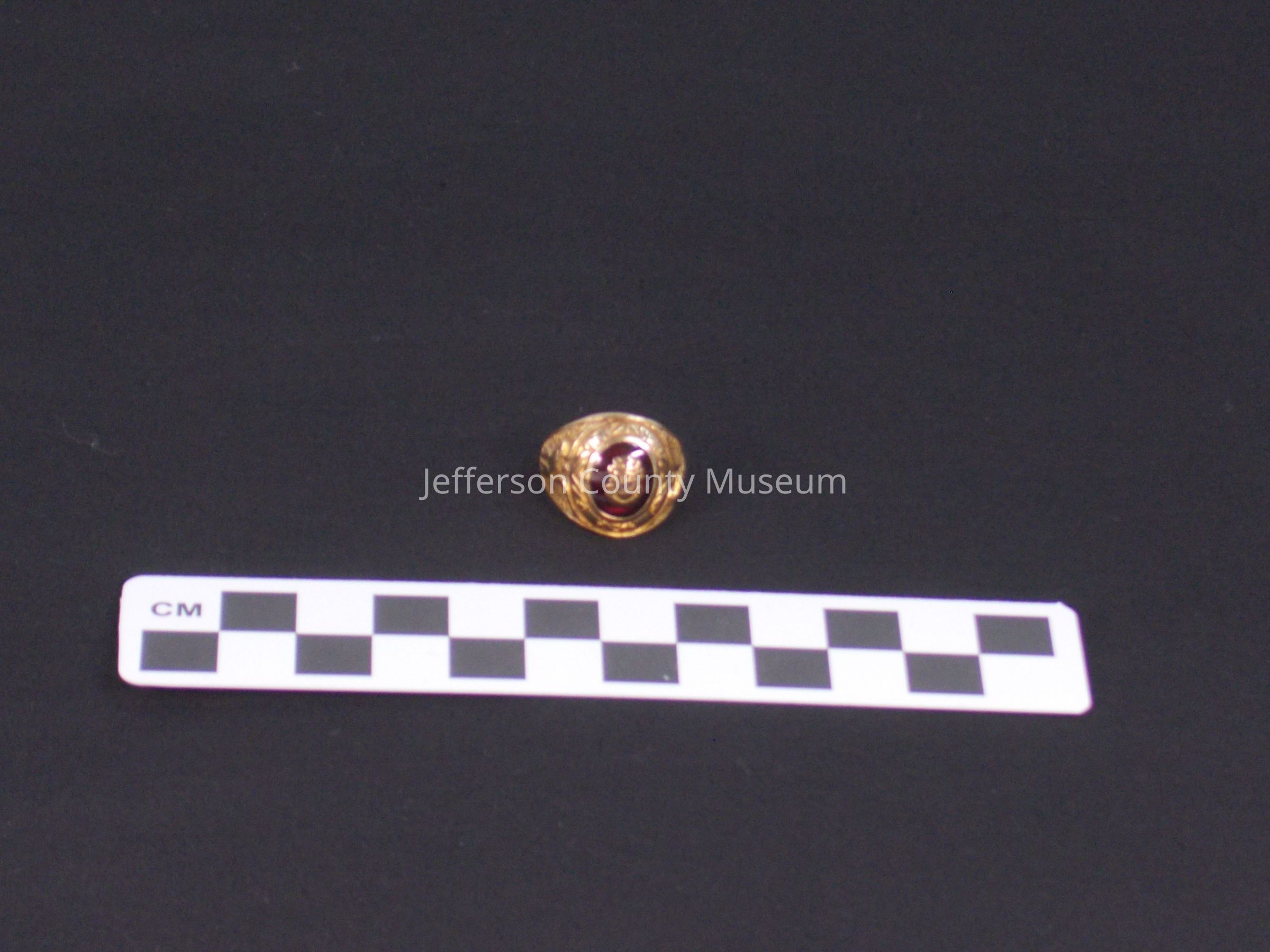 Gold high school ring with red stone. Crest with "HF" on stone. Eagle on each side with "1939" below. Initials inside "JAM". Maker's mark "TREASURE-CRAFT-DURA-TONE".