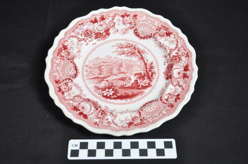 China plate with transferware design taken from C. Burton engraving of Shannondale Springs done circa 1831. Rose pink color. Stamp on back has design of eagle with spread wings and floral cornucopia. In center is "SHANNONDALE SPRINGS VIRGINIA U.S.".Acquisition