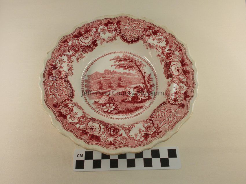 China soup bowl with transferware design from C. Burton engraving of Shannondale Springs circa 1831. Rose pink color. Stamp on back has design of eagle with spread wings and floral cornucopias. In center is "SHANNONDALE SPRINGS VIRGINIA U.S."Acquisition