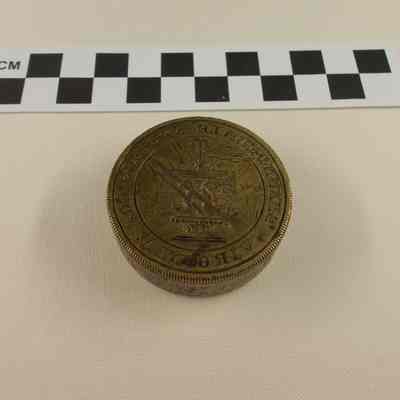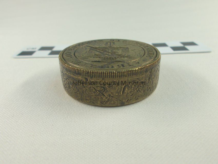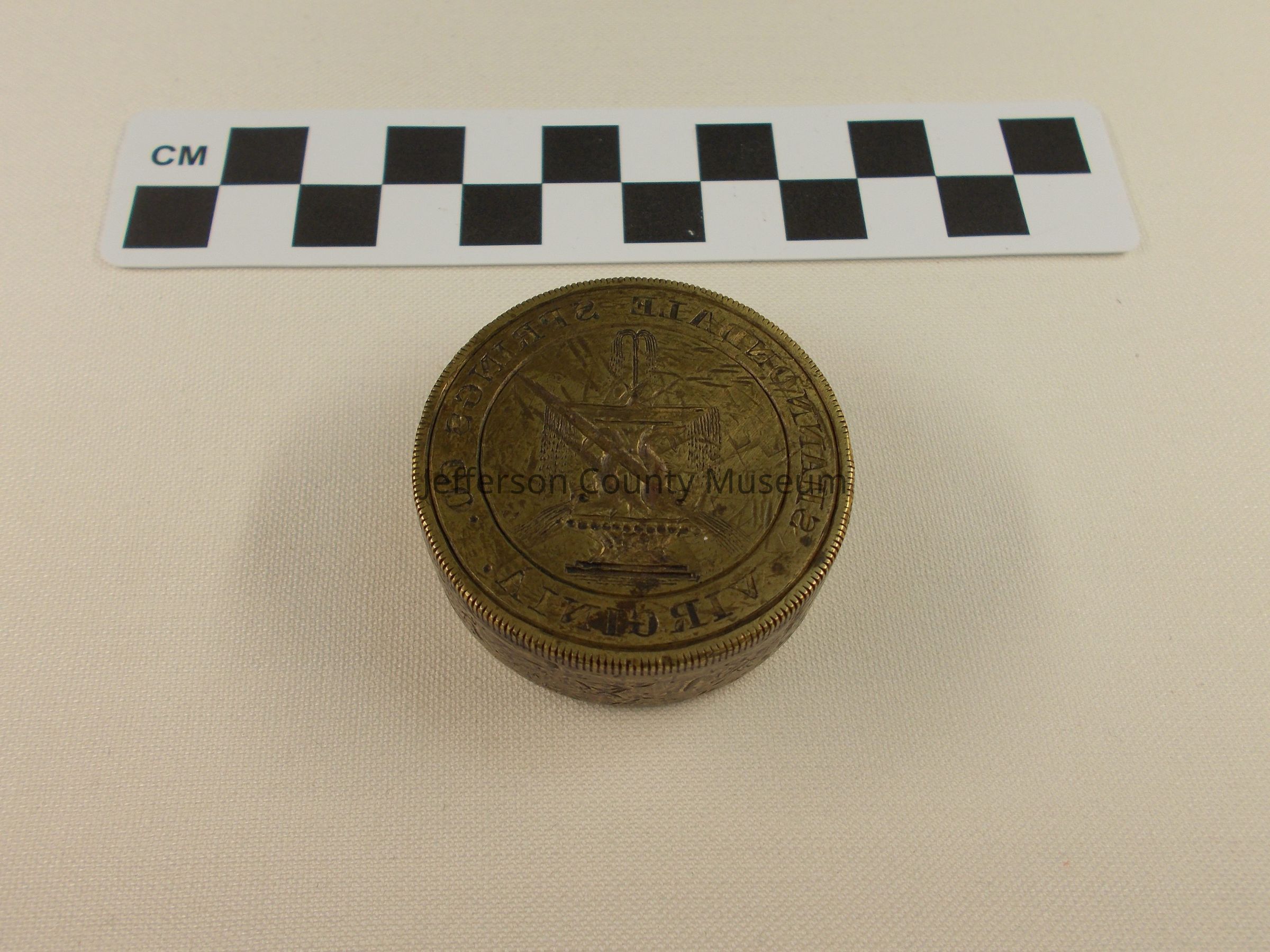 Official brass stamp seal of Shannondale Springs. Seal has fountain supported by two fish. Around edge "SHANNONDALE SPRINGS CO. VIRGINIA.". Also has paper with it with stamp in black ink (stored in accession file).Acquisition