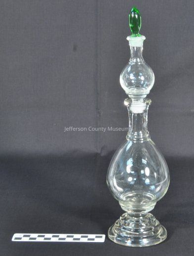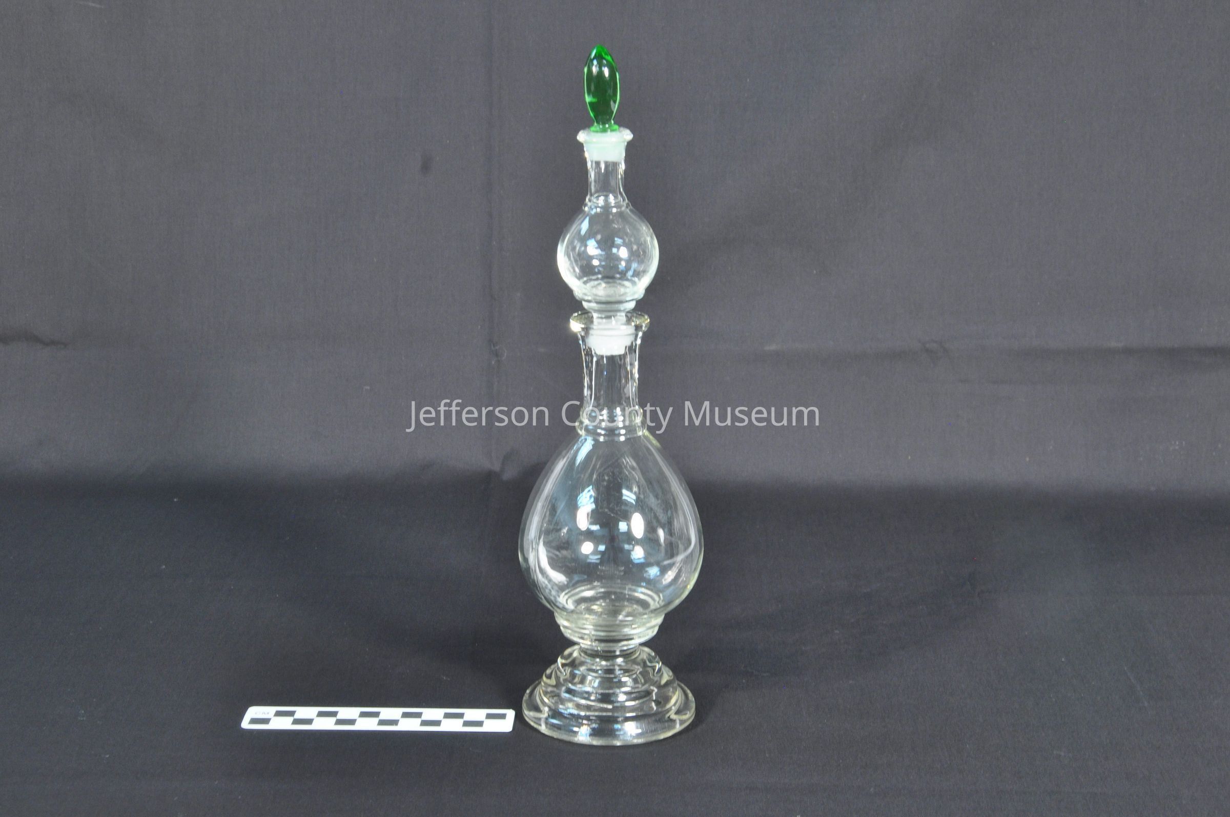 Clear glass apothecary bottle with light green stopper in top. Bottle is in three pieces. Center piece is designed as both stopper and container. Bottom and center are bulbous in shape.Acquisition