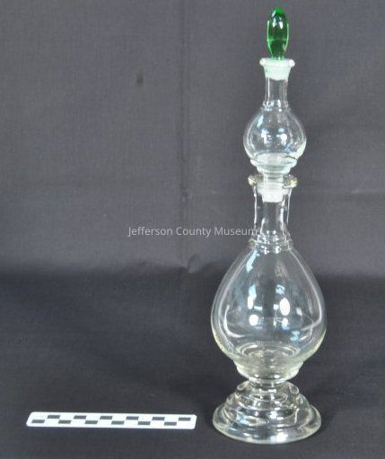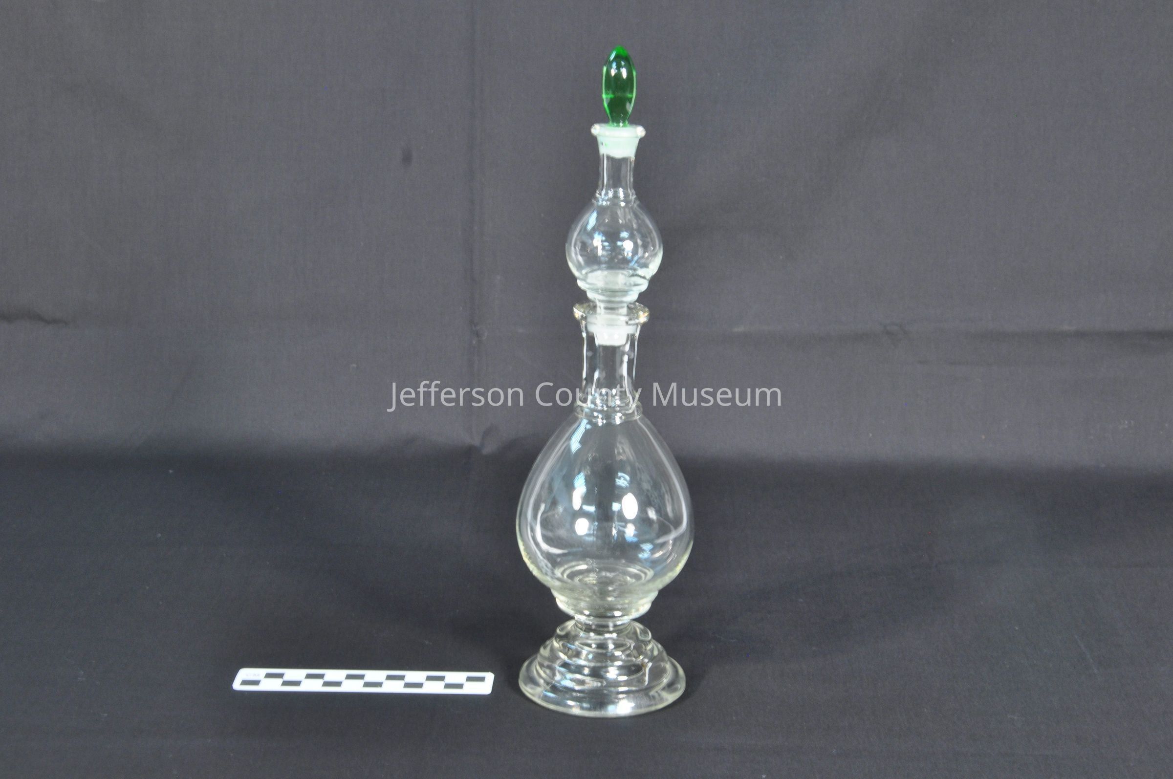Clear glass apothecary bottle with light green stopper in top. Bottle is in three pieces. Center piece is designed as both container and stopper. Bottom and center are bulbous in shape.Acquisition