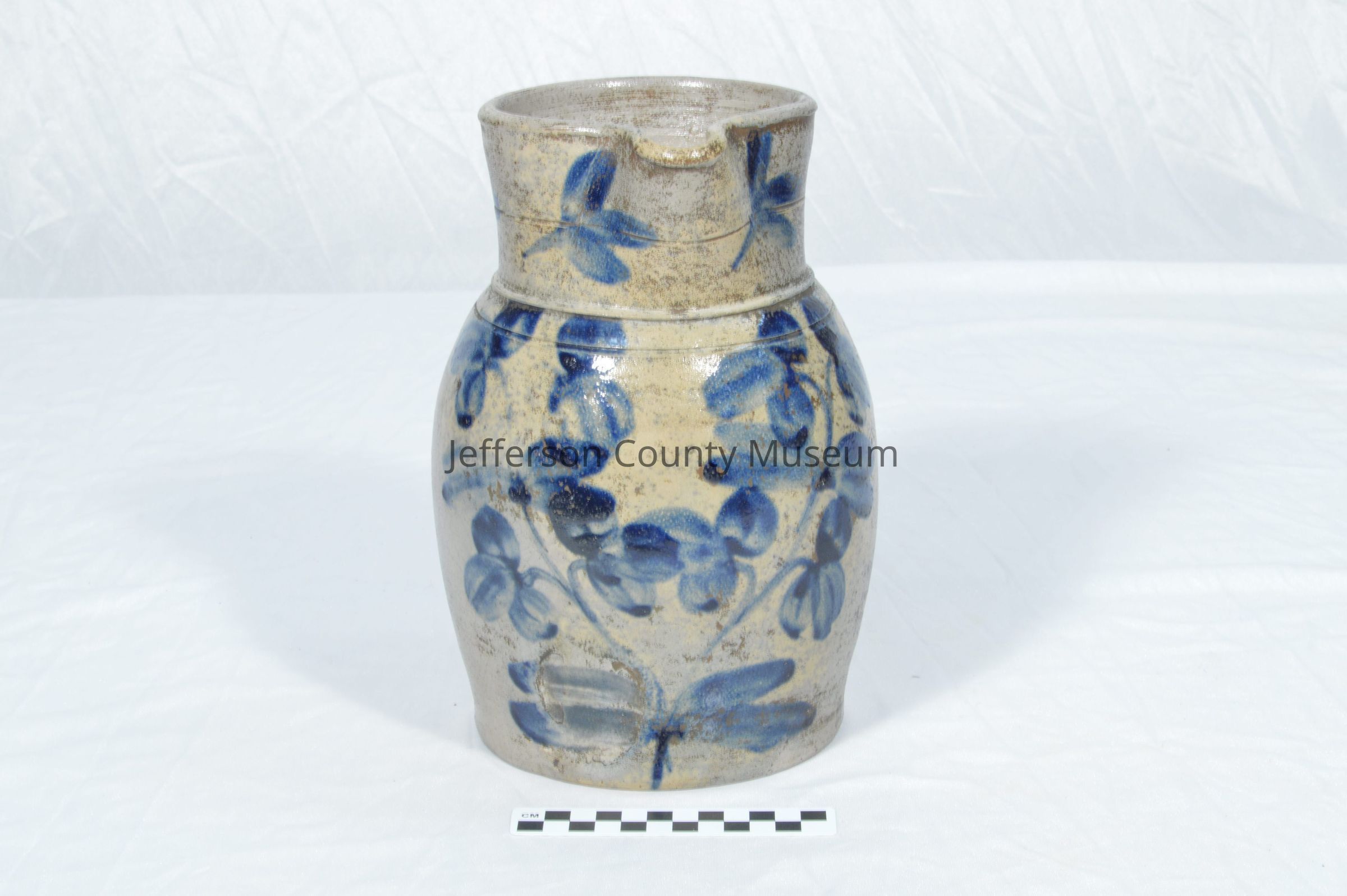 Large earthenware saltglaze pitcher with handle and pinched lip for pouring. Blue glaze leaf design.Acquisition