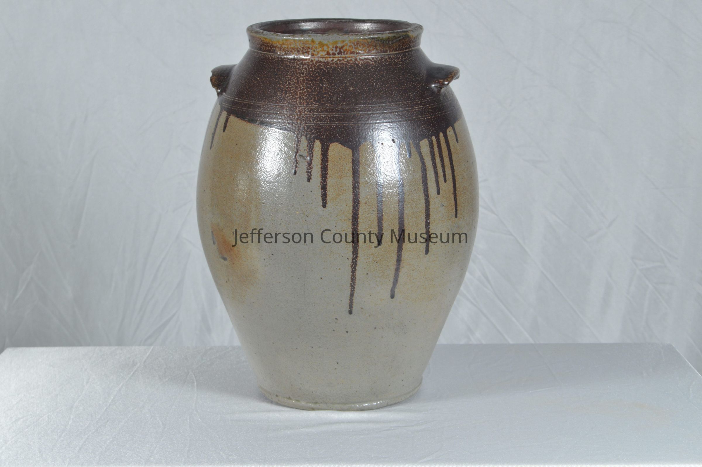 Large earthenware storage jar with dark brown glaze around top. Glaze was allowed to run down side of jar. Handles formed into the sides. Circa 1820.
