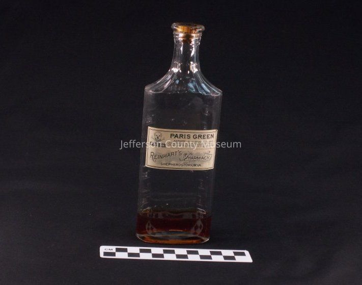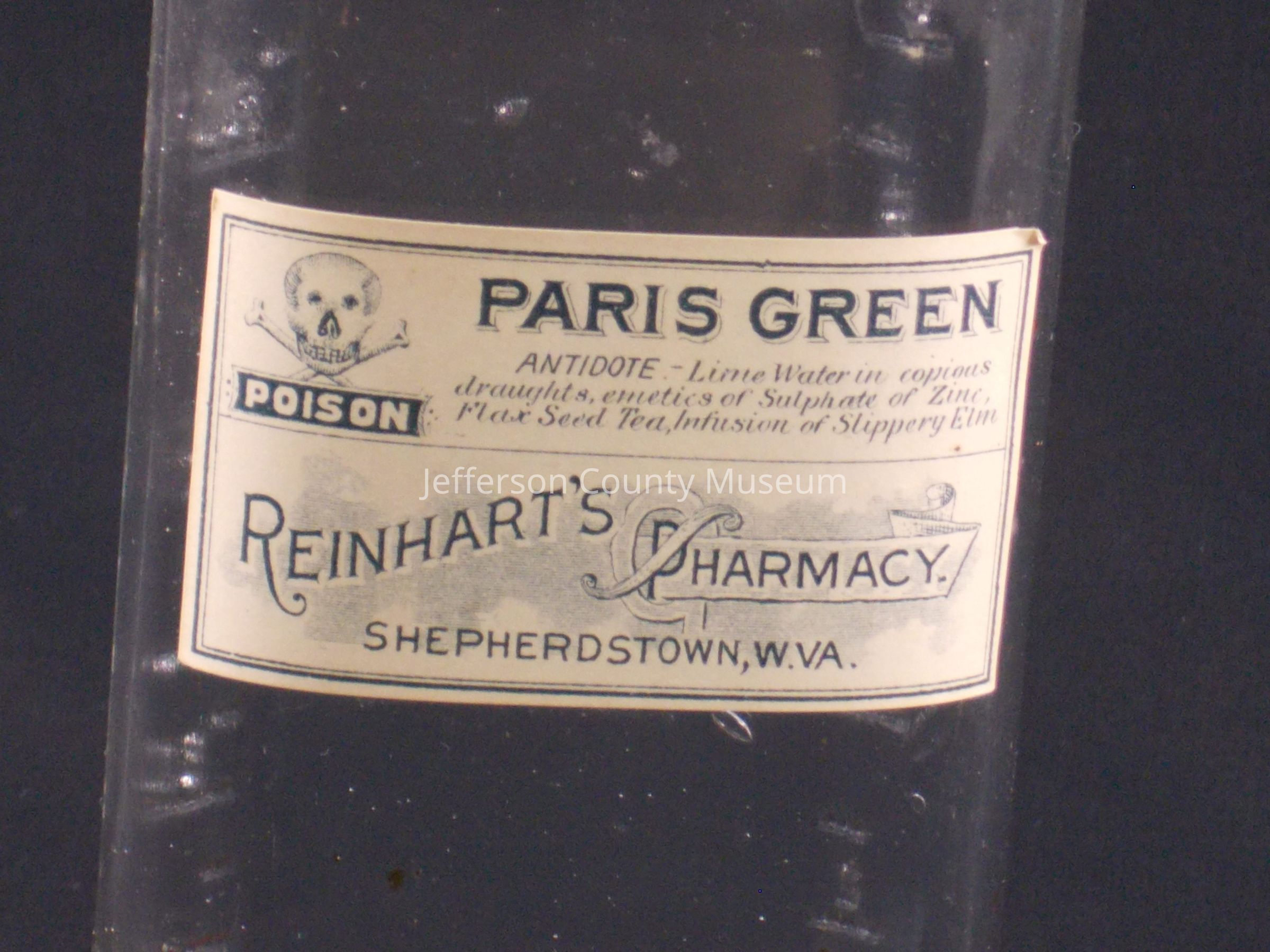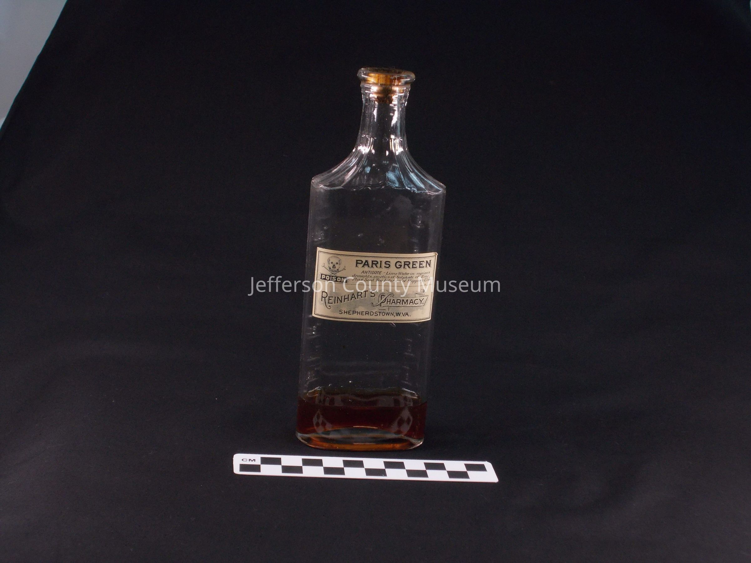 Pharmacy bottle with paper label. Label says "PARIS GREEN POISON REINHART'S PHARMACY SHEPHERDSTOWN, W. VA.". Cork in bottle. About 40 cc. of brown liquid in bottle. Bottle has ounces and cc. embossed on it.Acquisition