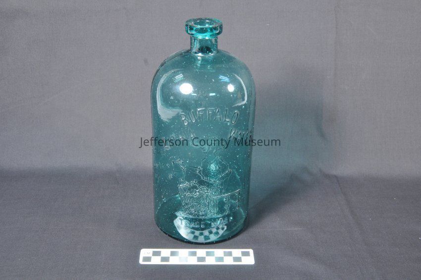Light green glass bottle. Embossed on bottle "BUFFALO LITHIA WATER NATURES MATERIA MEDICA TRADE MARK". Shows woman in robe sitting on bench holding a pitcher.Acquisition