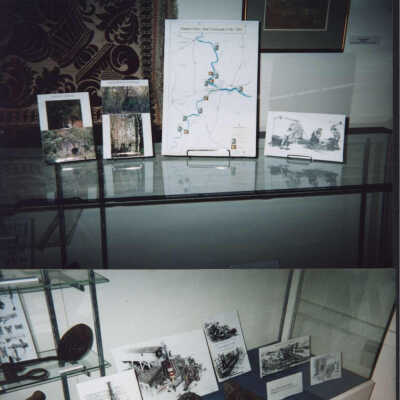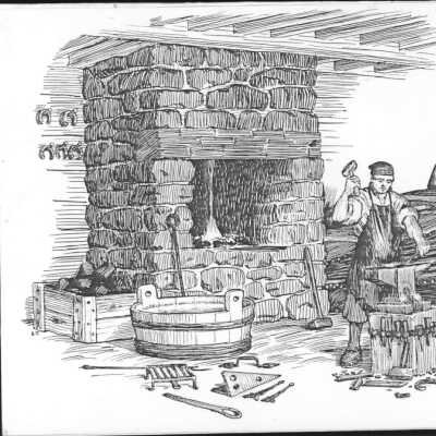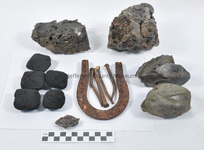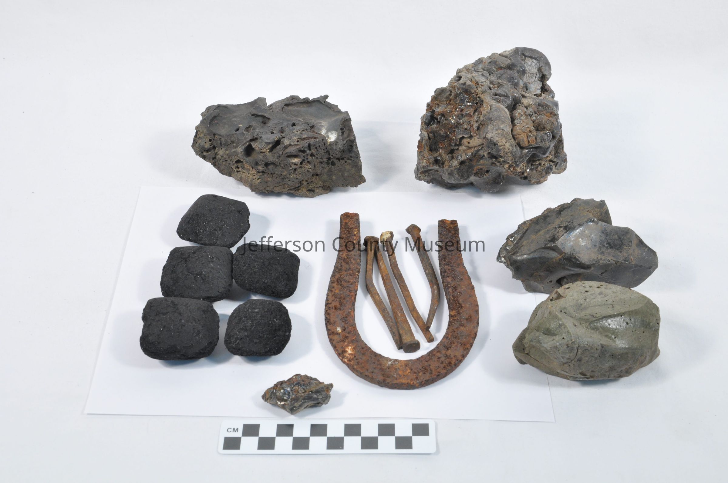 Exhibit titled "A Celebration of Iron". Includes two modern photos of remains of Vestal's Furnace and two modern photos of remains of Shenandoah Furnace. Also includes four illustrations of the iron making process, an illustration of the Federal Armory at Harpers Ferry, and two illustrations of boating on the Patowmack Canal. In addition there is a map of iron furnaces in the area and a color illustration of an iron furnace. There are also three pieces of slag from a furnace, a large piece of iron ore, a rough piece of pig iron, two pieces of limestone, and two pieces of blue-green slag, one darker and smaller than the other. Included are eight blacksmith-made nails, a railroad spike, and a horseshoe. Included are three photos of Dr. Dickinson's older exhibit of iron making that was in the Jefferson County Museum a few years before 2011.Also included is a piece of charcoal and copies of images from the JCM collection that were part of the "Forging Ahead" iron industry exhibit at Jefferson County Museum between 2016 and 2018.Acquisition