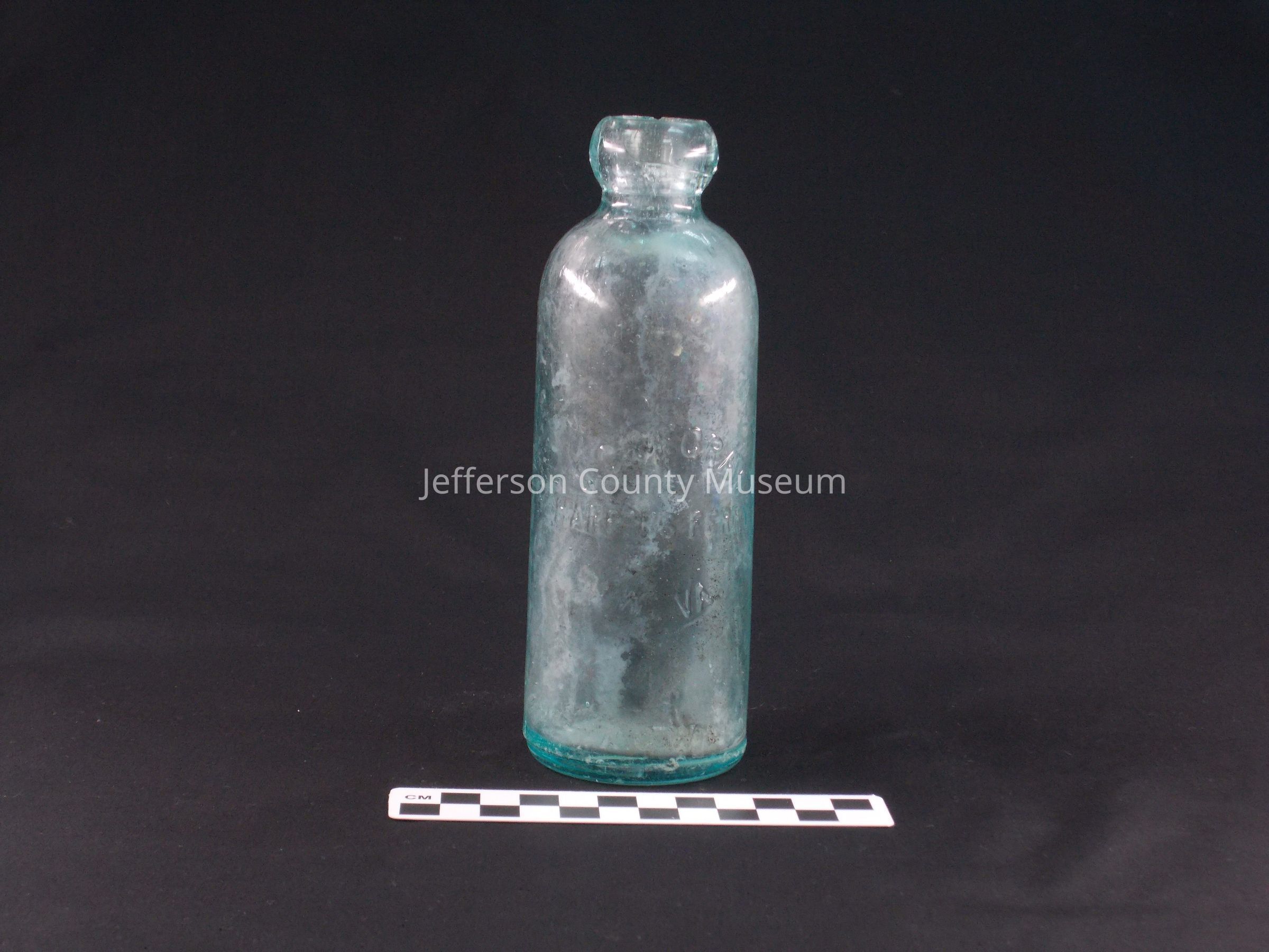 Blue-green glass beverage bottle. Bulbous top. Embossed in circle on front "J.C. McGRAW HARPERS FERRY W.VA." At bottom "THIS BOTTLE NOT TO BE SOLD AGWL".Acquisition