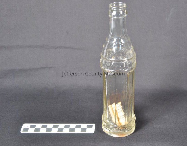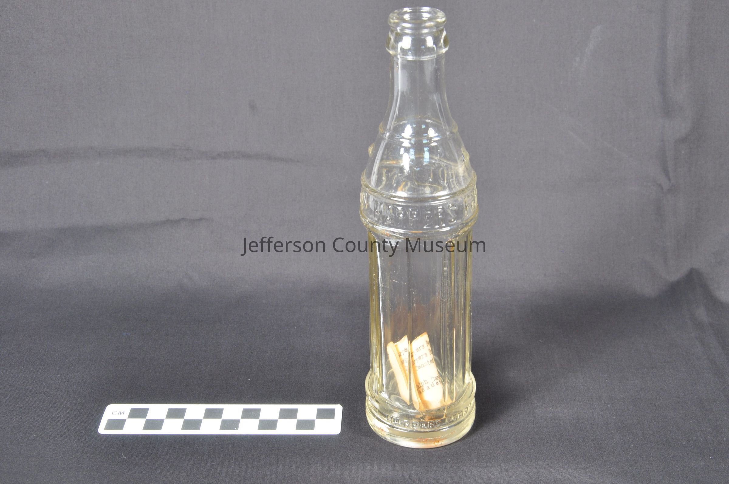 Clear glass beverage bottle. Embossed around bottle "HARPERS FERRY BOTTLING WKS HARPERS FERRY W.VA. CONTENTS 7 FLU. OZS." Inside of the bottle is a label for Harpers Ferry Bottling Works.Acquisition