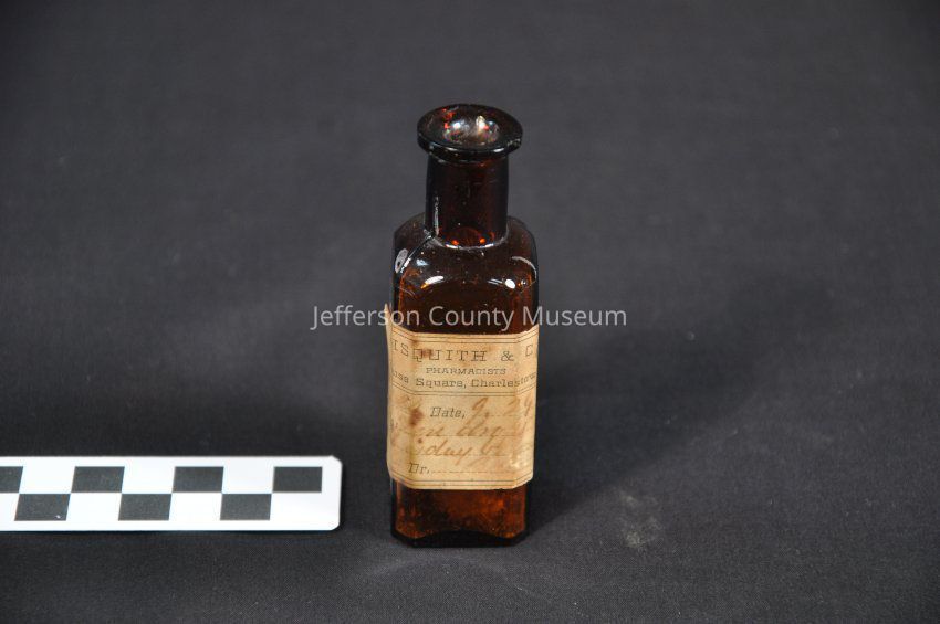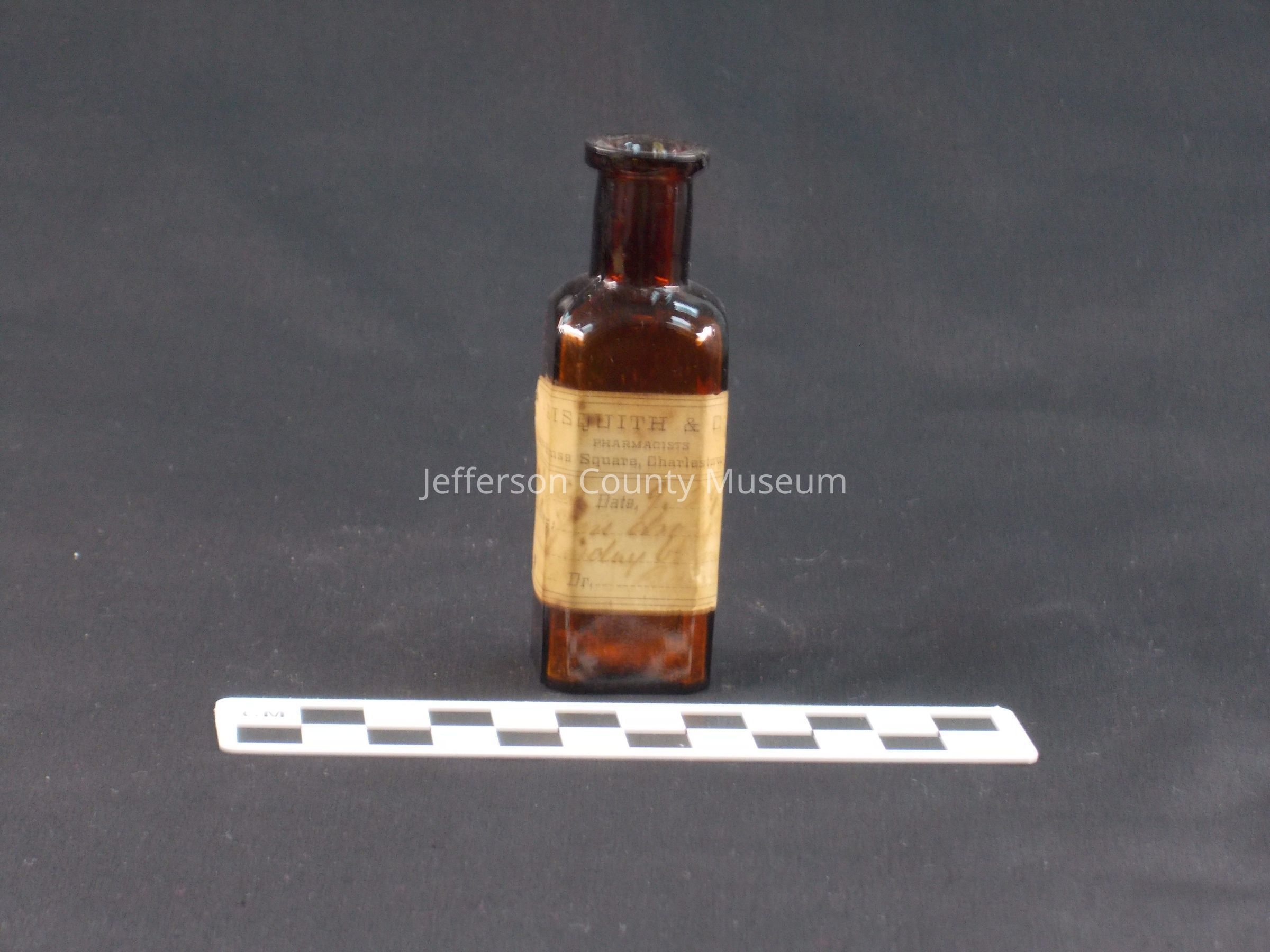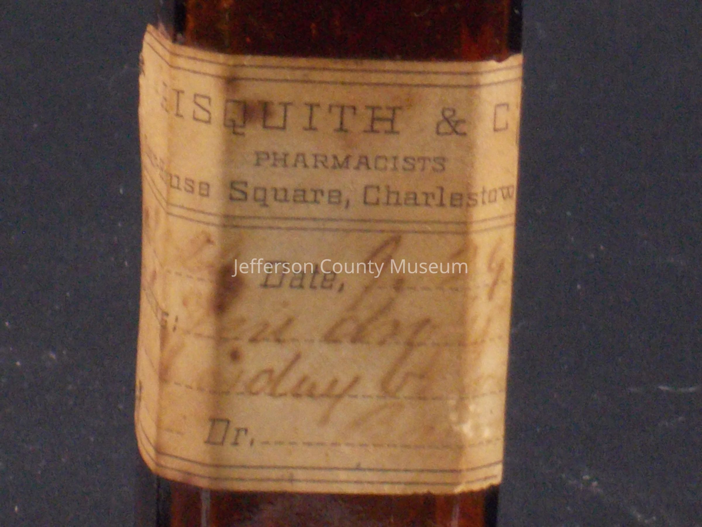 Dark brown rectangular pharmacy bottle. Paper label "AISQUITH & CO. PHARMACISTS Court-House Square, Charlestown, W.Va.". On bottom "WT & Co.".Acquisition