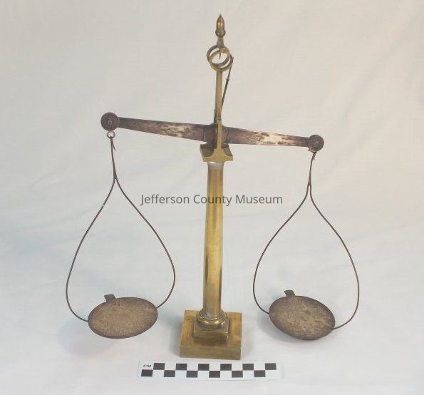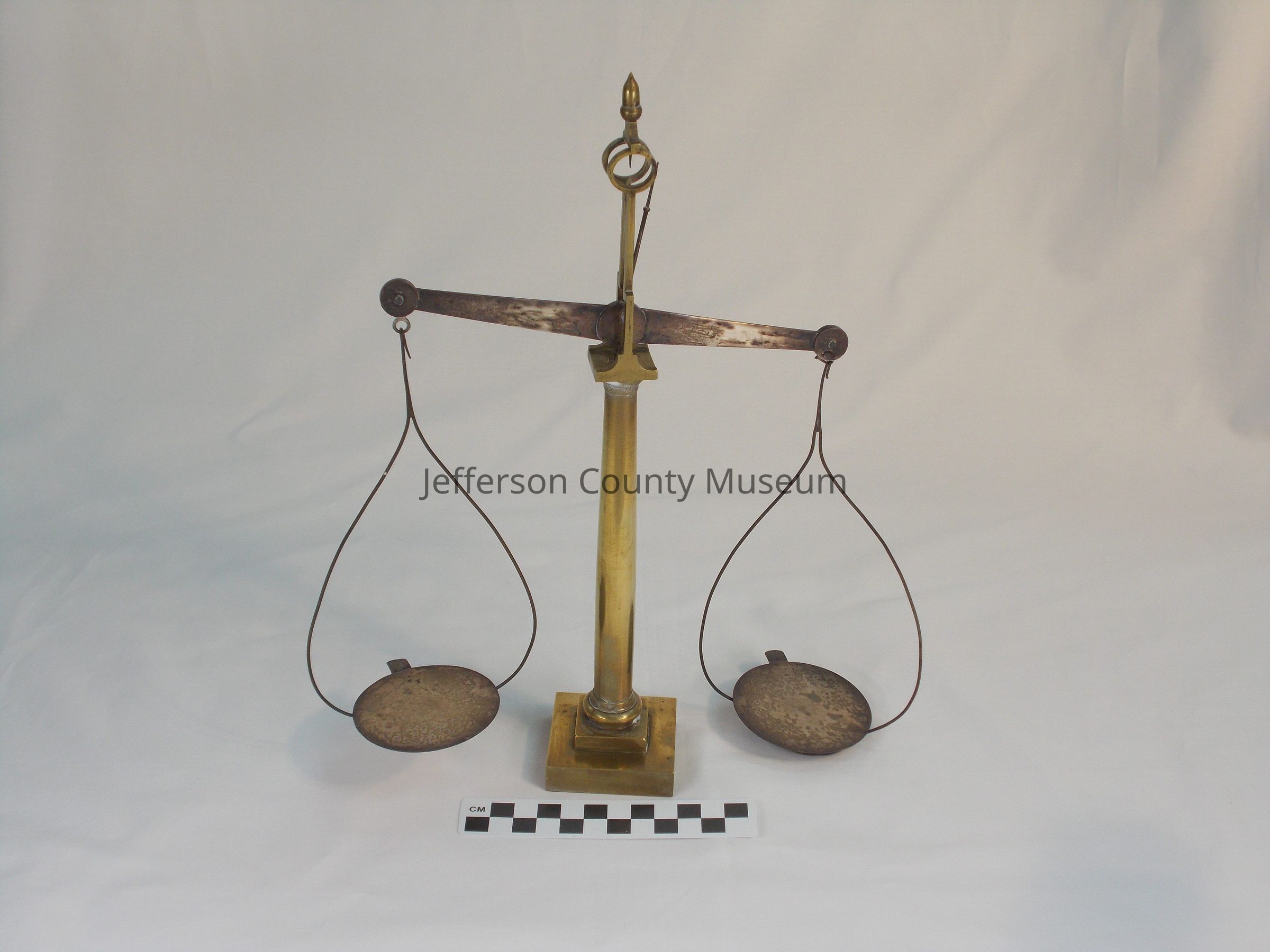 Brass scales. Silver colored disk on each scale to hold drugs. Balance arm is also silver colored.Acquisition