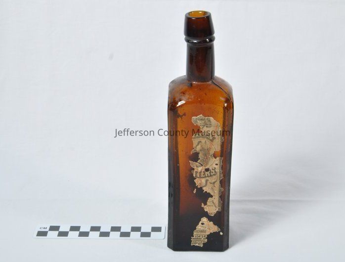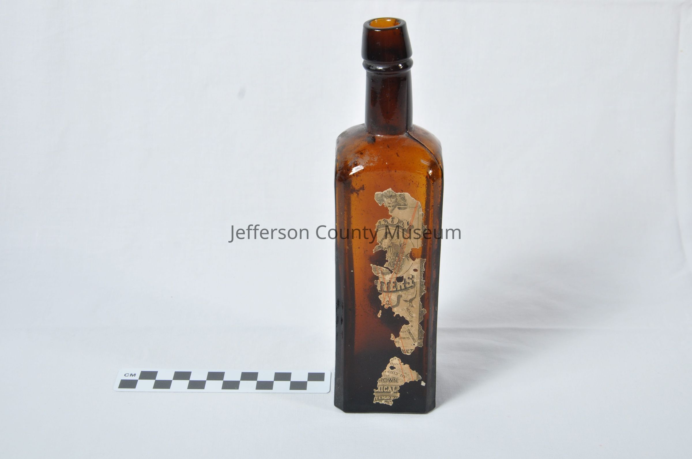 Dark brown glass pharmacy bottle. Remnants of paper label on front and back. Front says "BROWN'S IRON BITTERS". Back says "BROWN'S CHEMICAL Co.". Top is slightly curved to one side.Acquisition