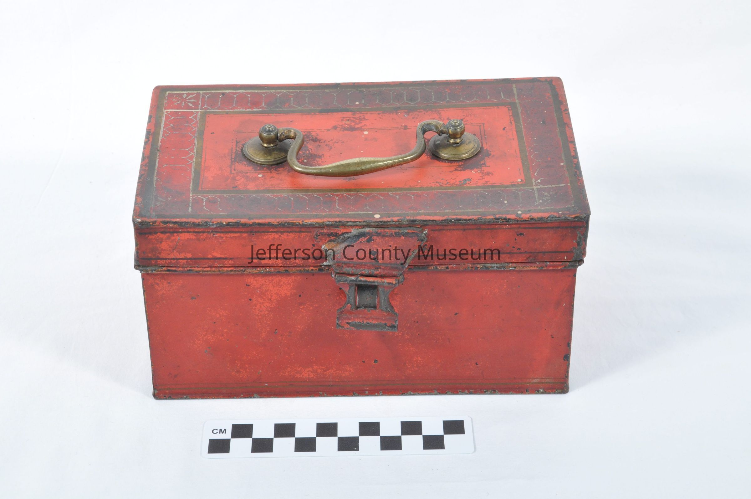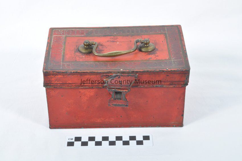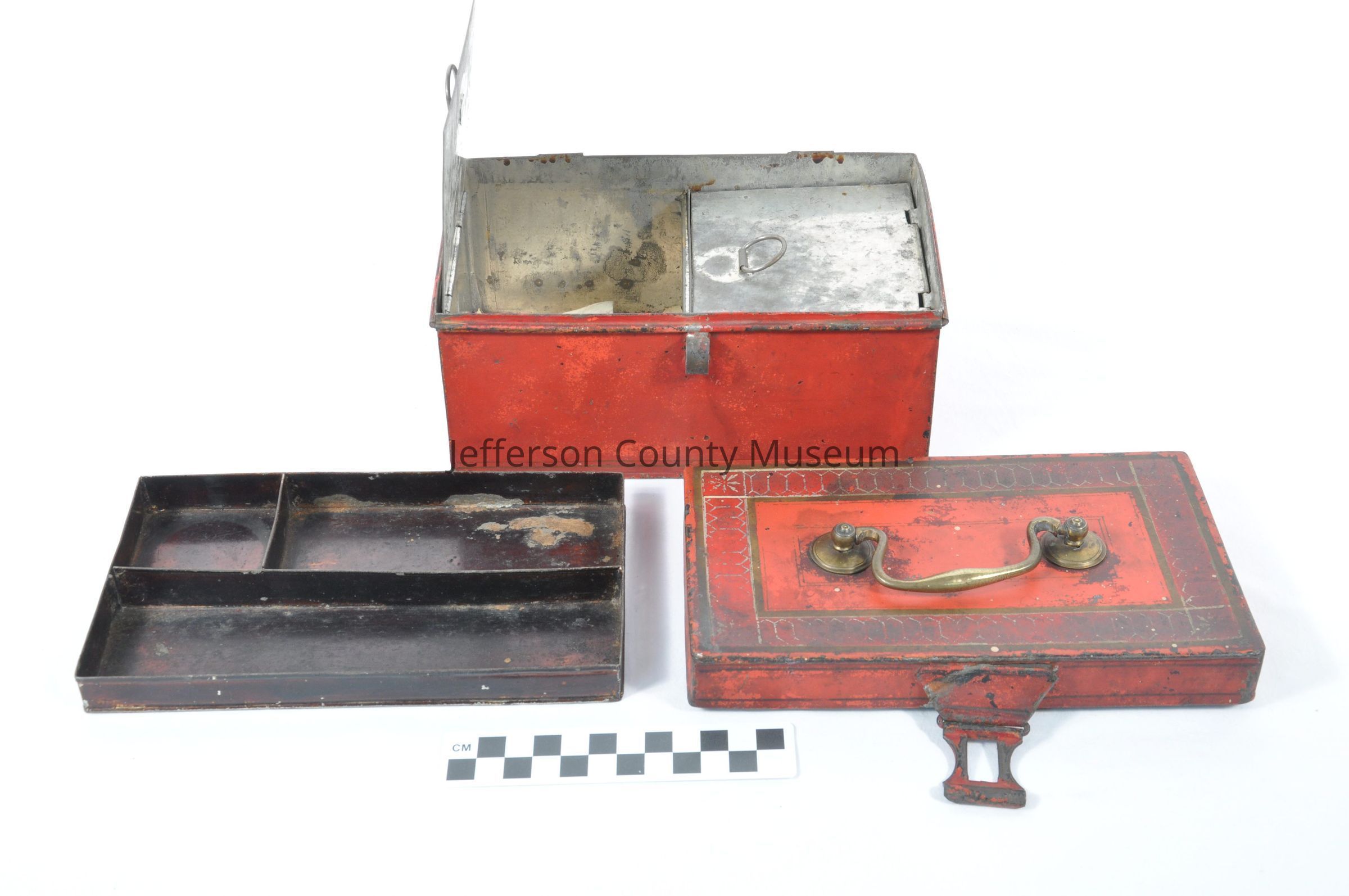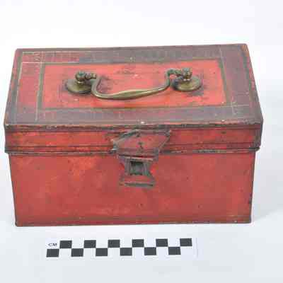 Tin, decorated medical box. Originally a red color. Has compartments below a tray inside. Tray is divided into 3 sections. Brass handle on top. Purportedly belonged to Dr. Nelson West, who was Gen. Robert E. Lee's doctor.Acquisition