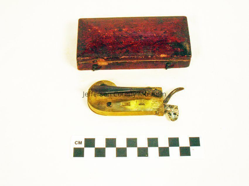 A spring loaded lever holds the blade against the point to be bled. Box with it is covered with dark red leather or paper material. Bleeder is labeled "822a" and box is labeled "822b".Acquisition