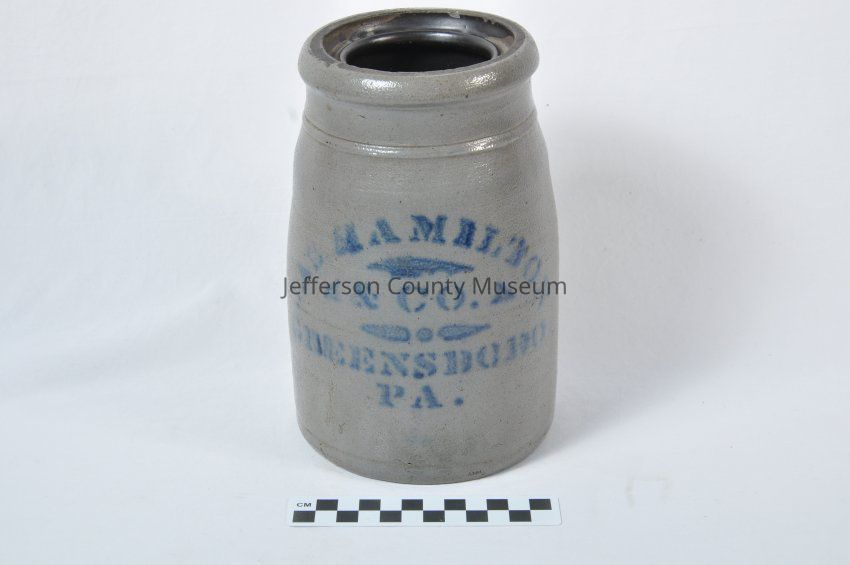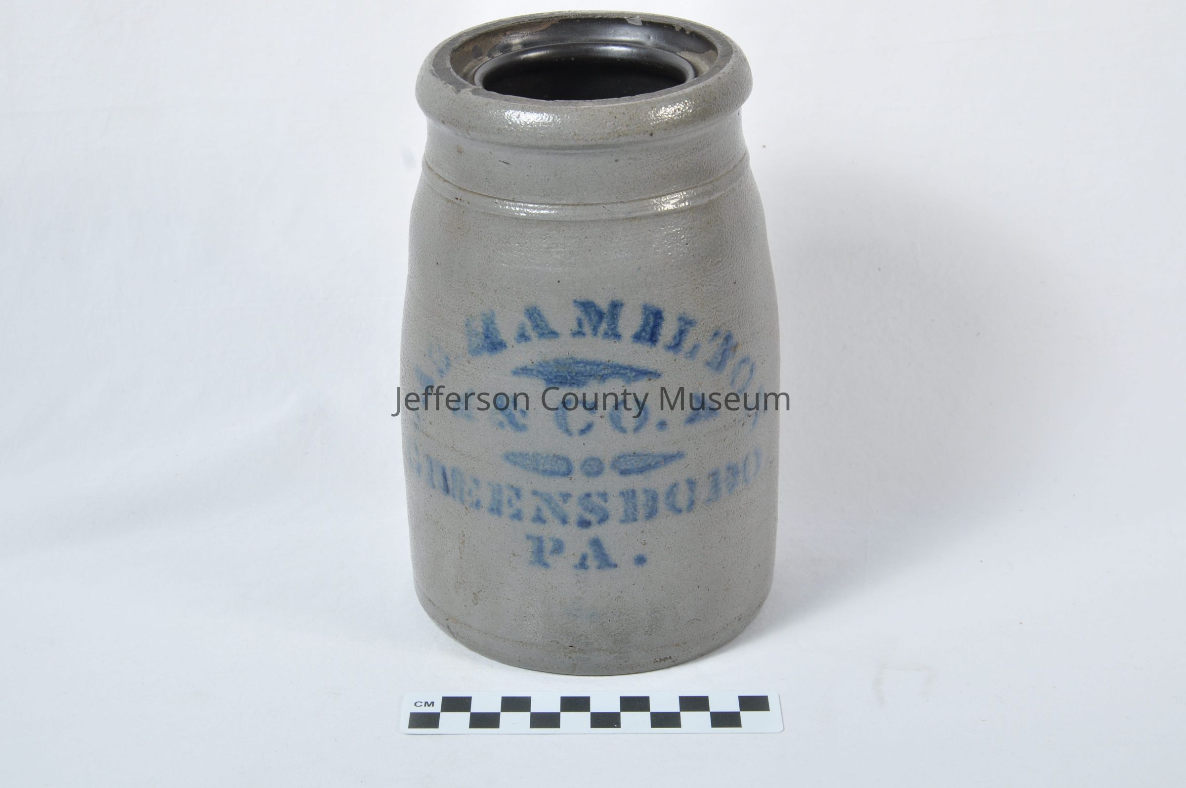 Stoneware canning crock. Stencilled letters in cobalt "JAS. HAMILTON & CO. GREENSBORO, PA."Acquisition