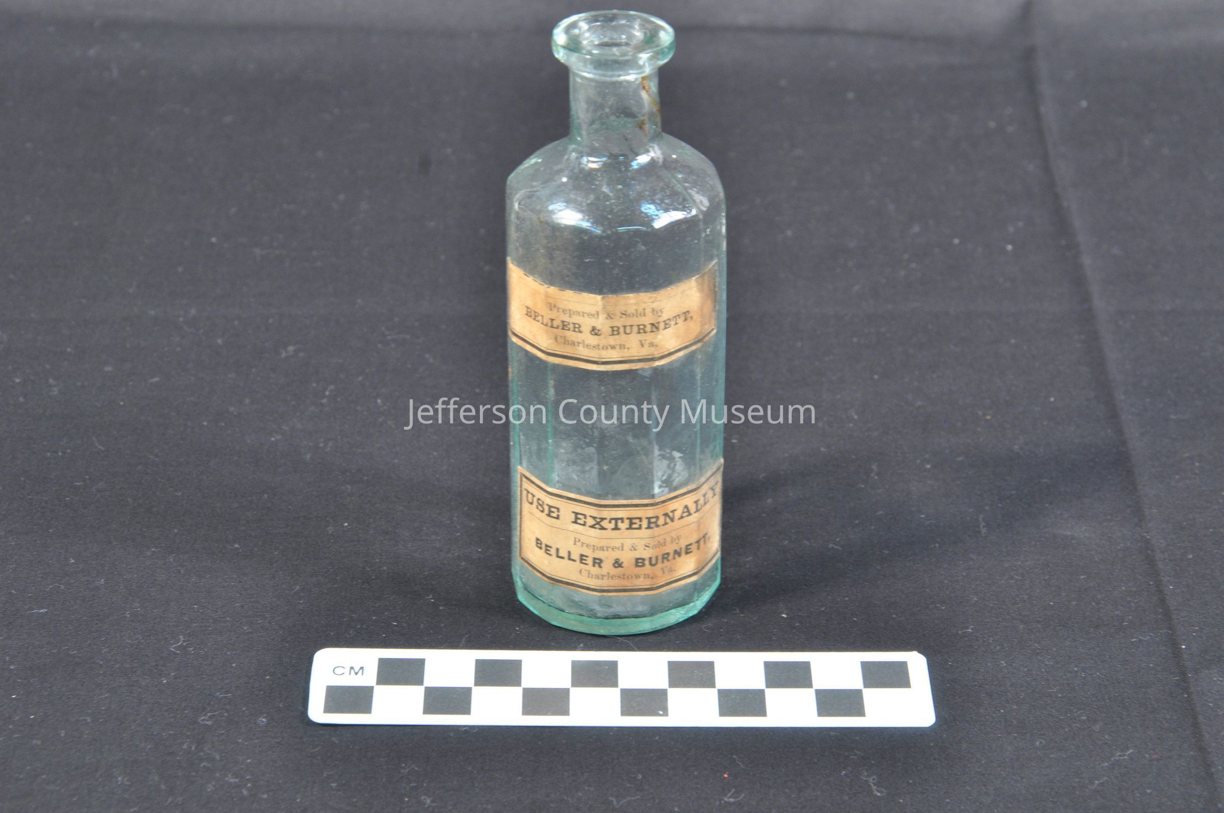 Pharmacy bottle with two labels. Top label "Prepared & Sold by BELLER & BURNETT Charlestown, Va." Bottom label "USE EXTERNALLY Prepared & Sold by BELLER & BURNETT Charlestown, Va." Bottle was probably made in 1840 due to the presence of a pontil scar on the bottom. Due to the presence of the typed label, this glass bottle may be assumed to have been recycled for use up into the early 19th century.Acquisition