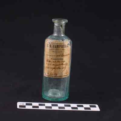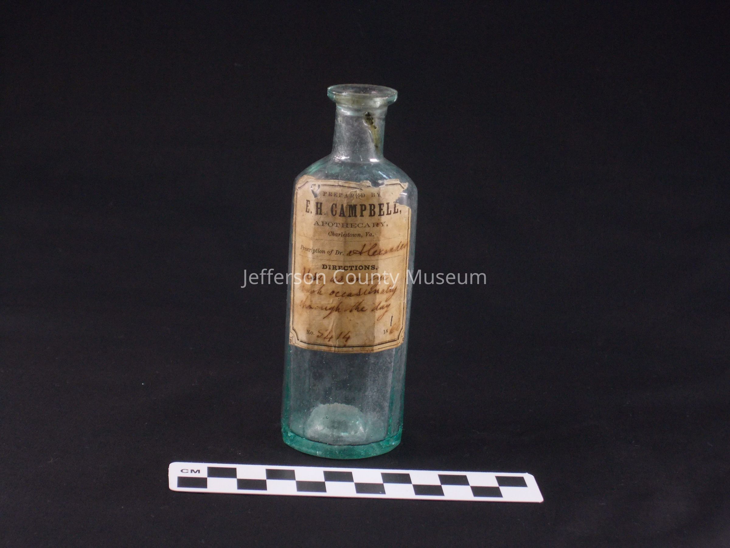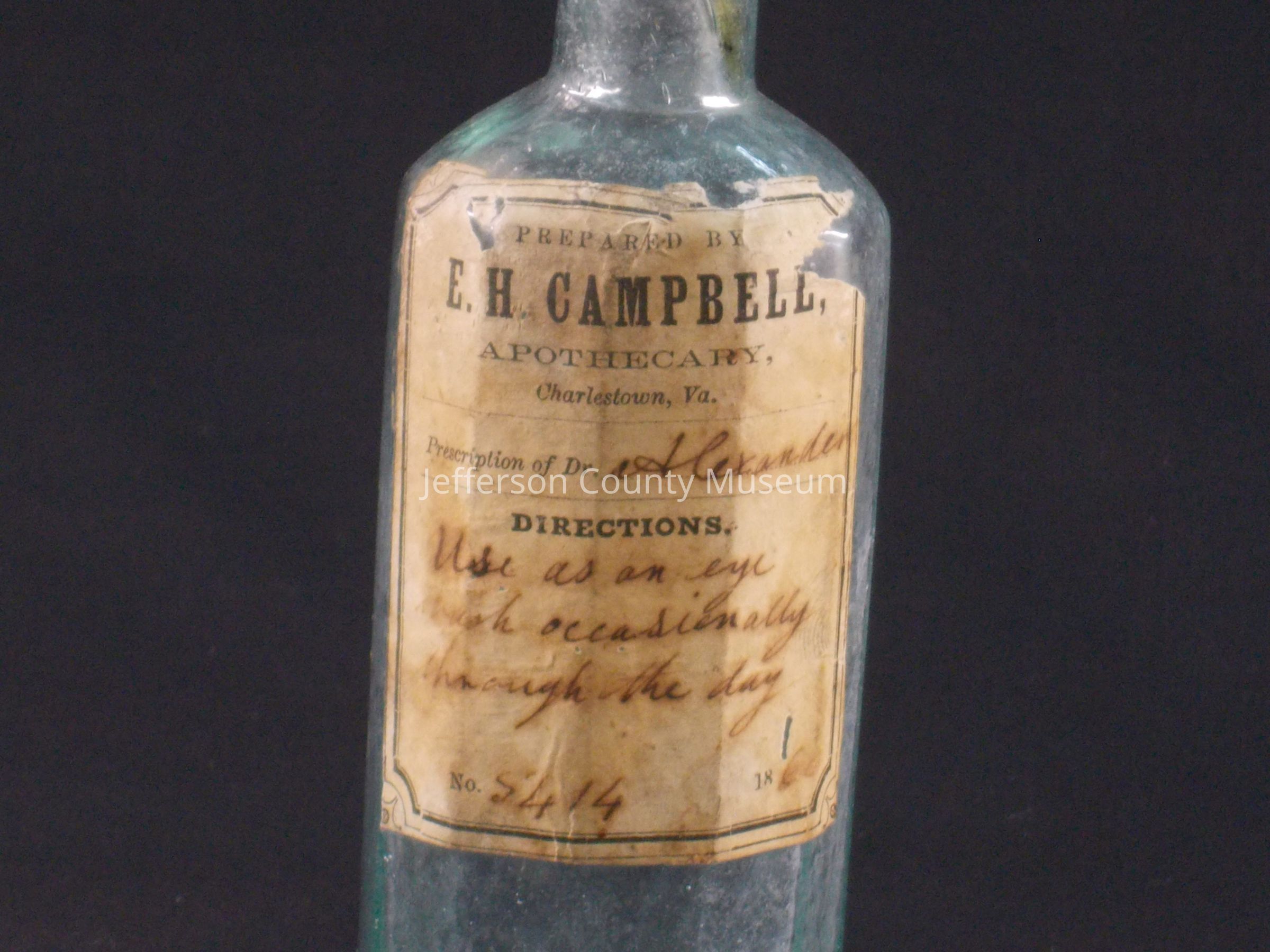 Pharmacy bottle from "E.H. CAMPBELL, APOTHECARY, Charlestown, Va. No cap. 12 sided. "DIRECTIONS. (Handwritten) Use as an eye wash occasionally through the day".