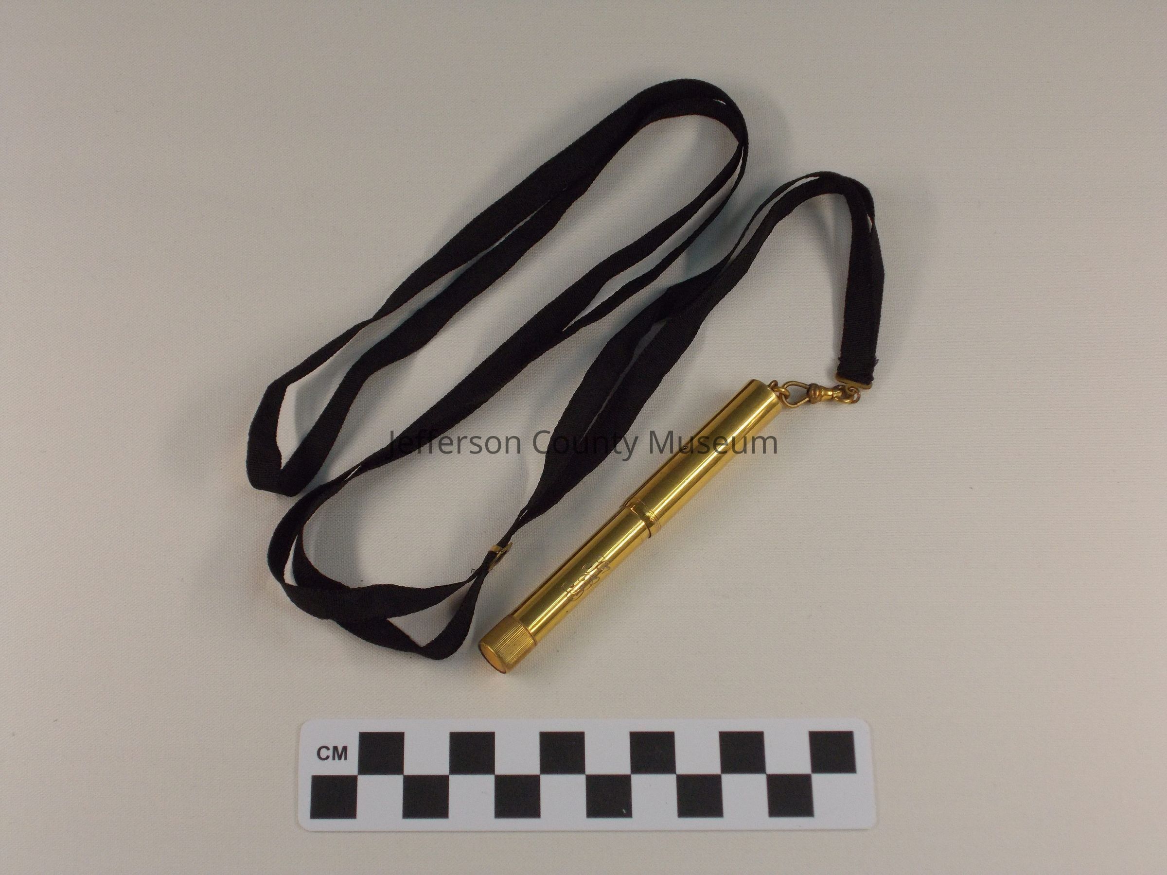 Brass fountain pen with black grosgrain ribbon for hanging around neck and brass snap. Initialed "KB". Stamped on end of pen "0552 1/2 V". Two parts of pen screw together.Acquisition
