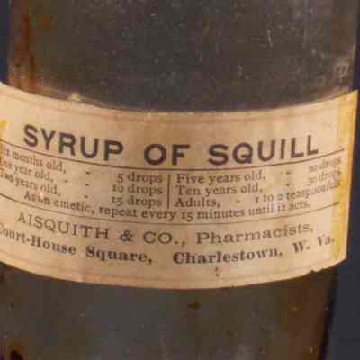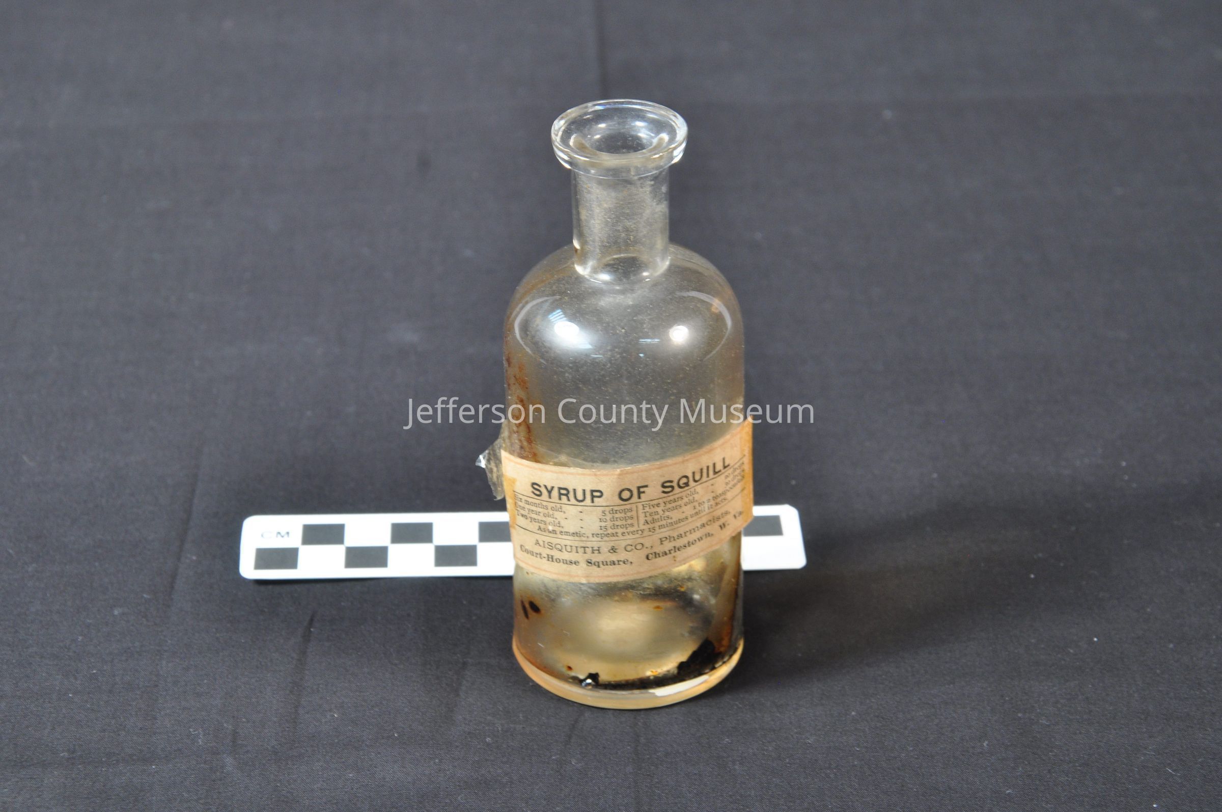 Pharmacy bottle with paper label "SYRUP OF SQUILL". Flat on one side, rest of bottle is round. Embossed on flat side "ASQUITH & CO PHARMACISTS court house SQUARE CHARLESTOWN W.VA." Black remnants of drug inside.Acquisition