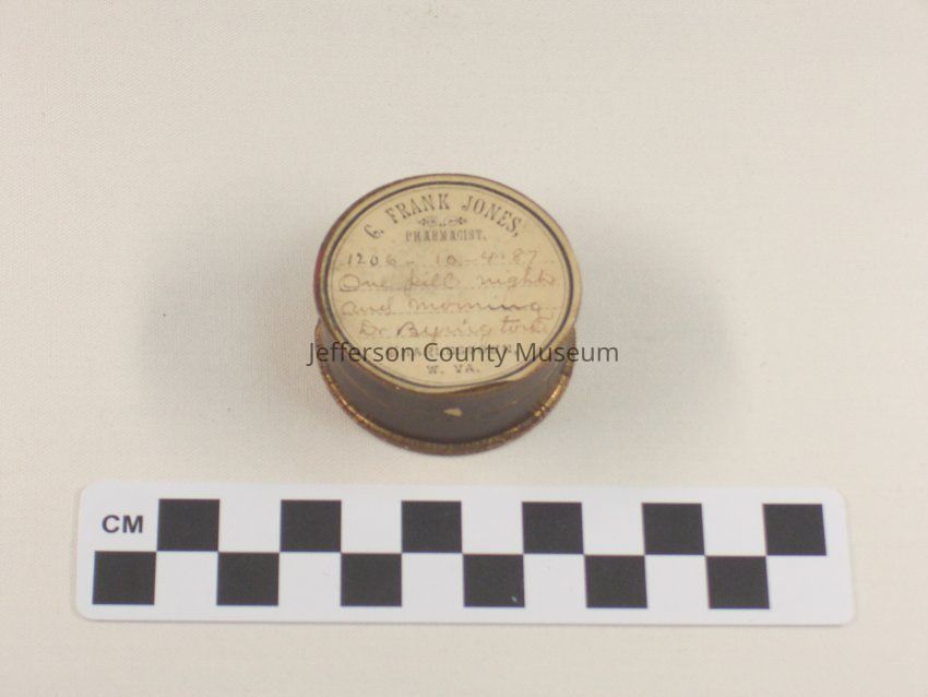 Round pill box "G. FRANK JONES, PHARMACIST, CHARLESTOWN, W.Va.". Dated 10-4-87. Label on back "This Prescription was put up by a Graduate of Pharmacy".Acquisition